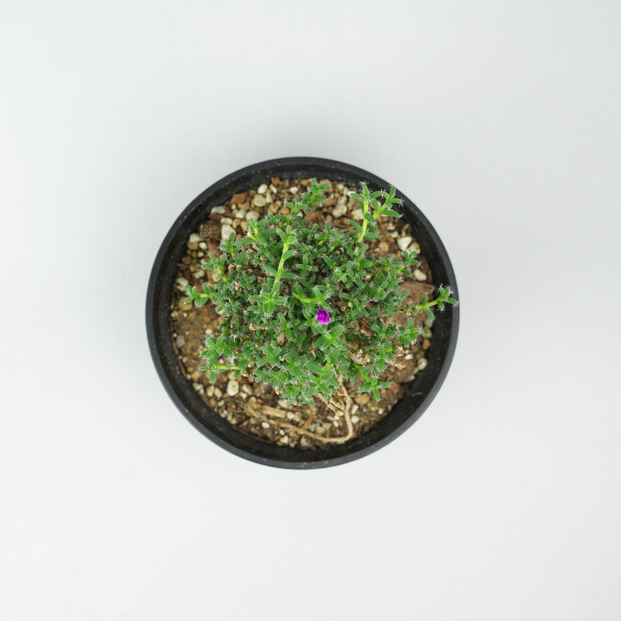 「トリコディアデマ・ブルボスム」(姫紅小松)(Trichodiadema bulbosum)は、南アフリカ原産のツルナ科(Aizoaceae)に属する塊根植物です。地中に塊状の根を持ち、地上部には多肉質の小さな葉を密につける姿が特徴。葉先には白い繊毛が冠のように広がり、陽光を浴びるとキラリと輝く美しさを見せます。可愛らしさの中に荒野を生き抜く強さを秘めた、魅力あふれるコーデックスです。