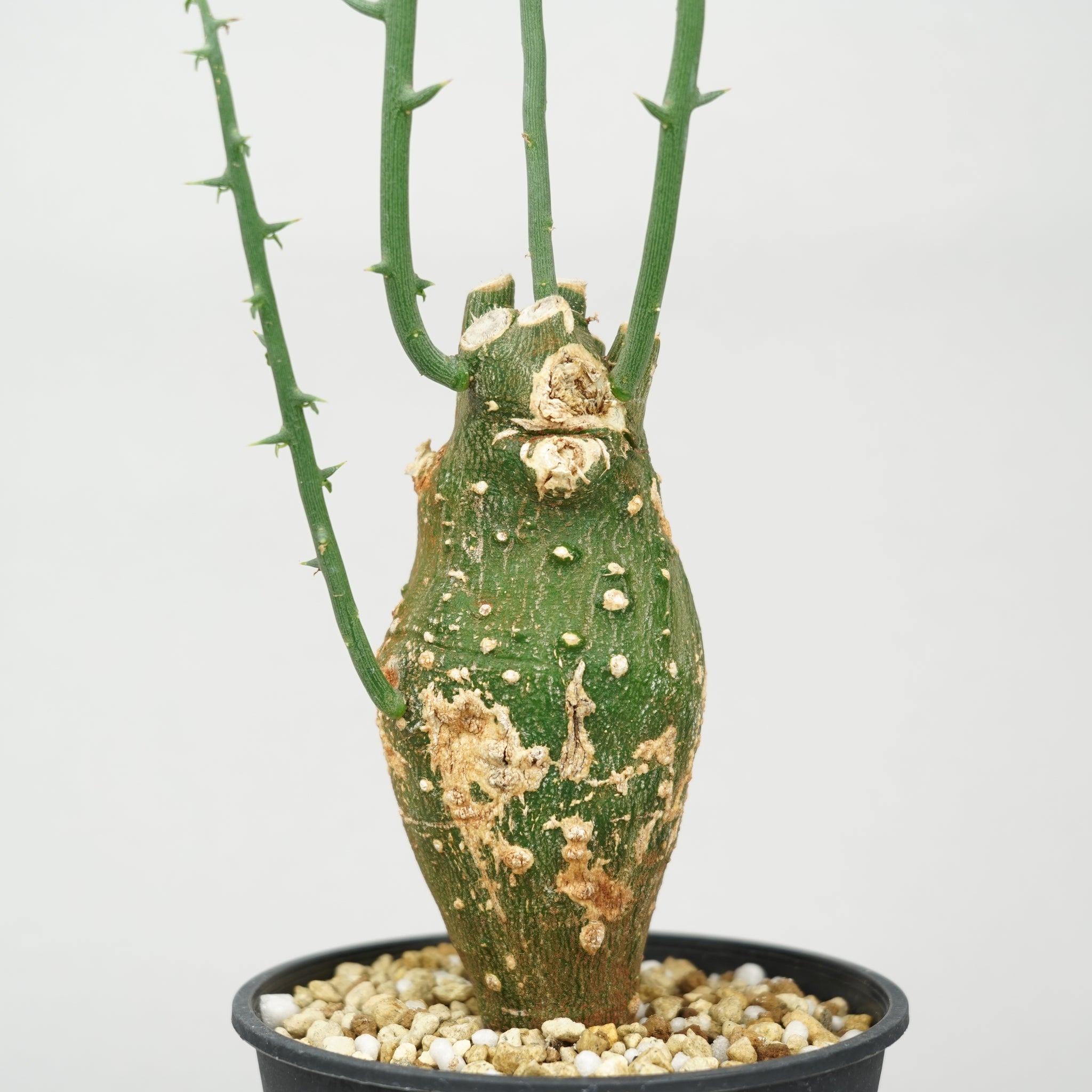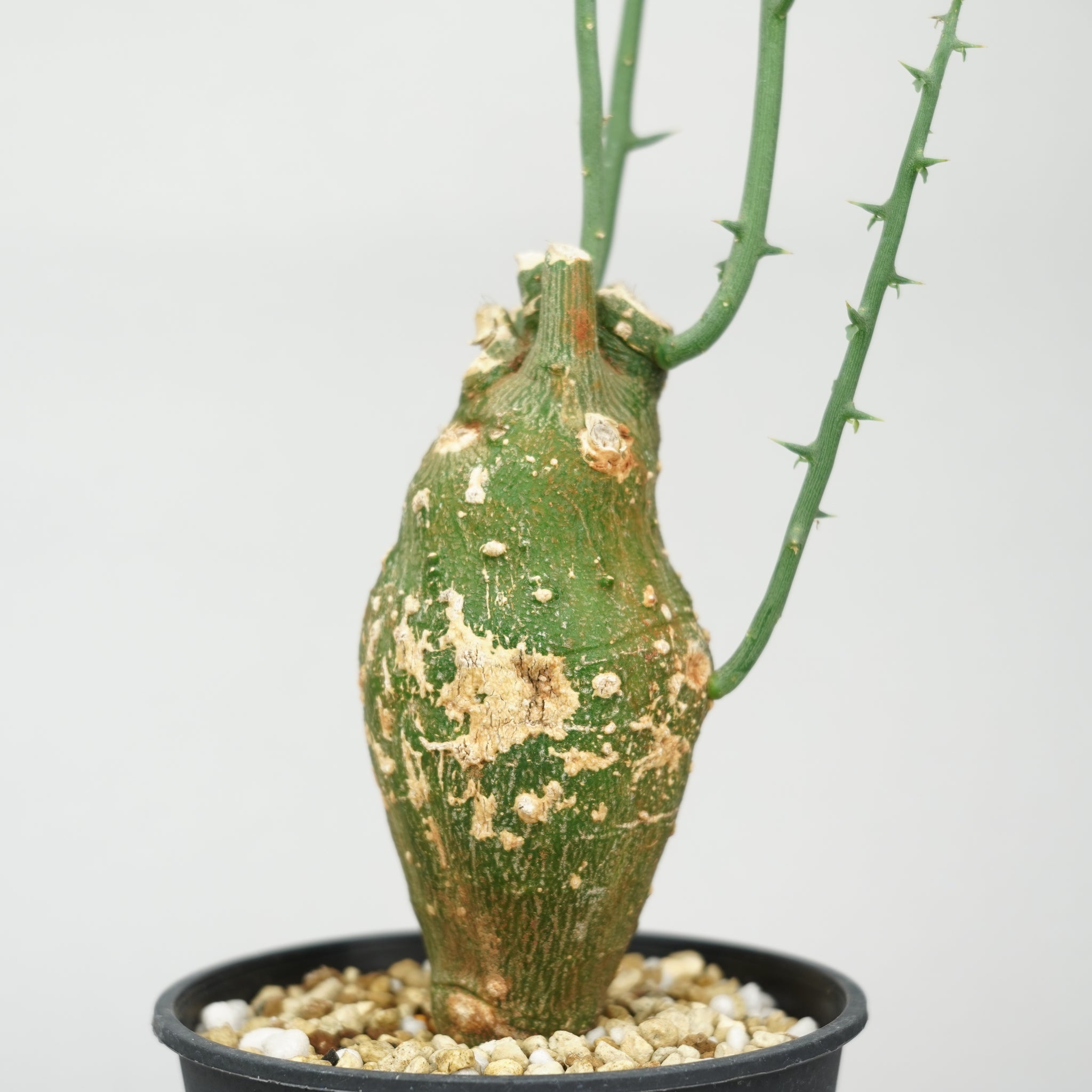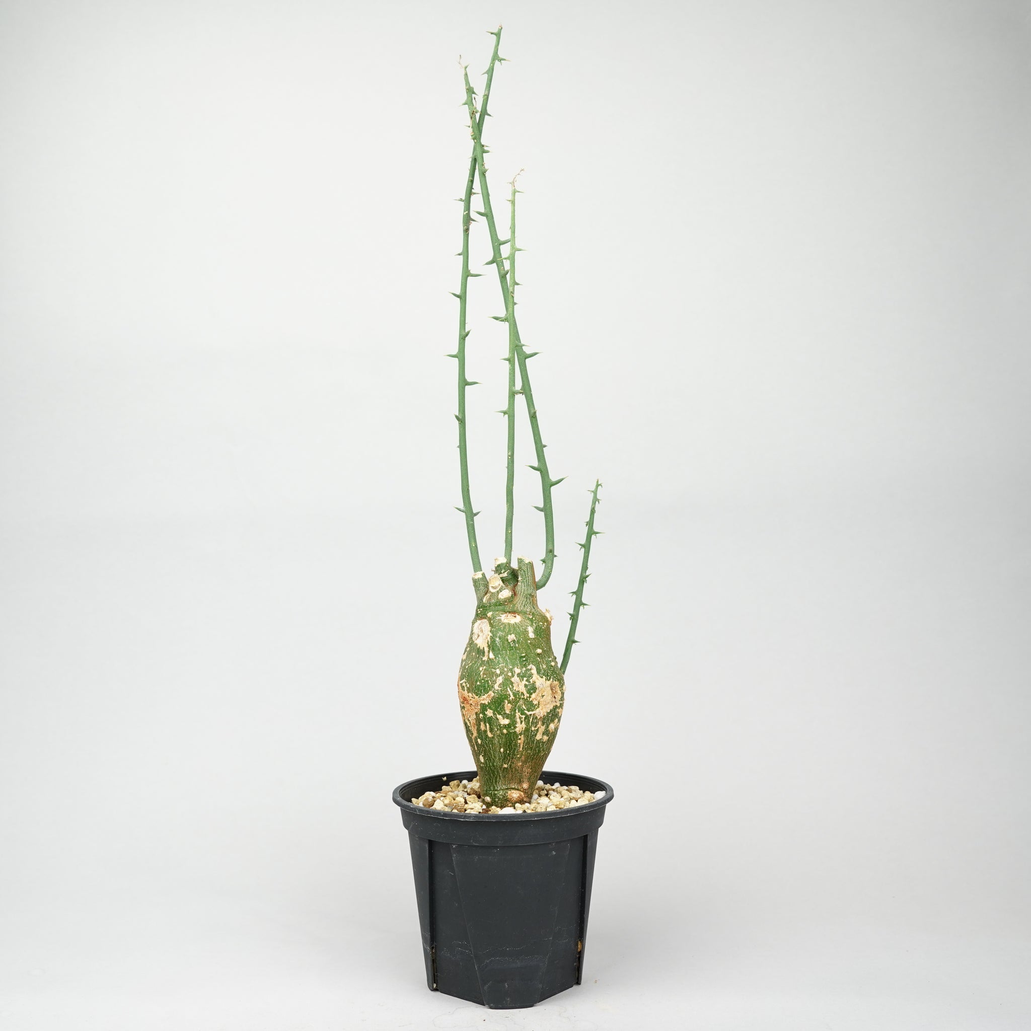 大きく丸みを帯びた塊根は重厚で、経年とともに表面の質感が増し、野性味ある風格へと育つ。塊根から立ち上がる枝は鋭く伸び、ワイルドで立体的なシルエットを形成。