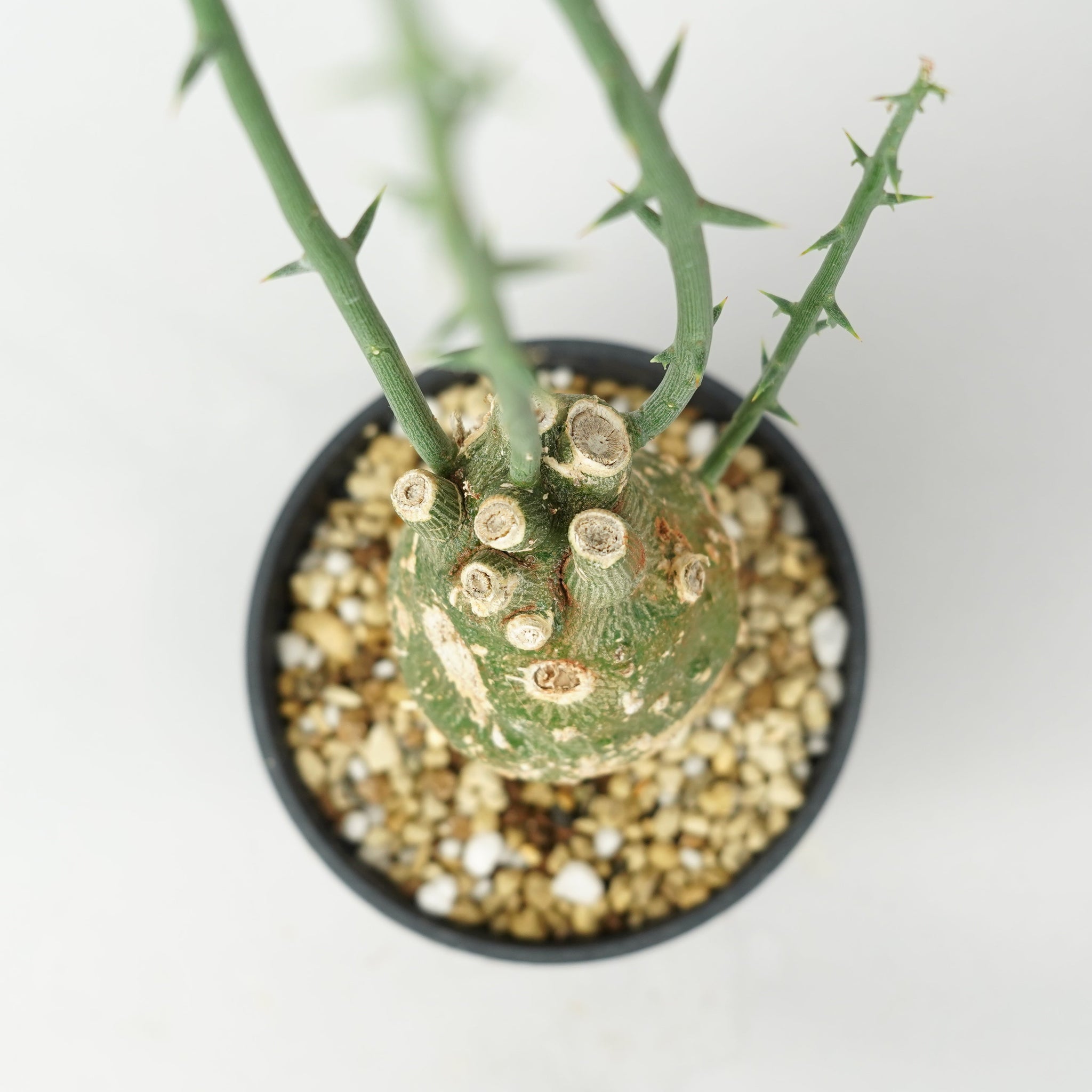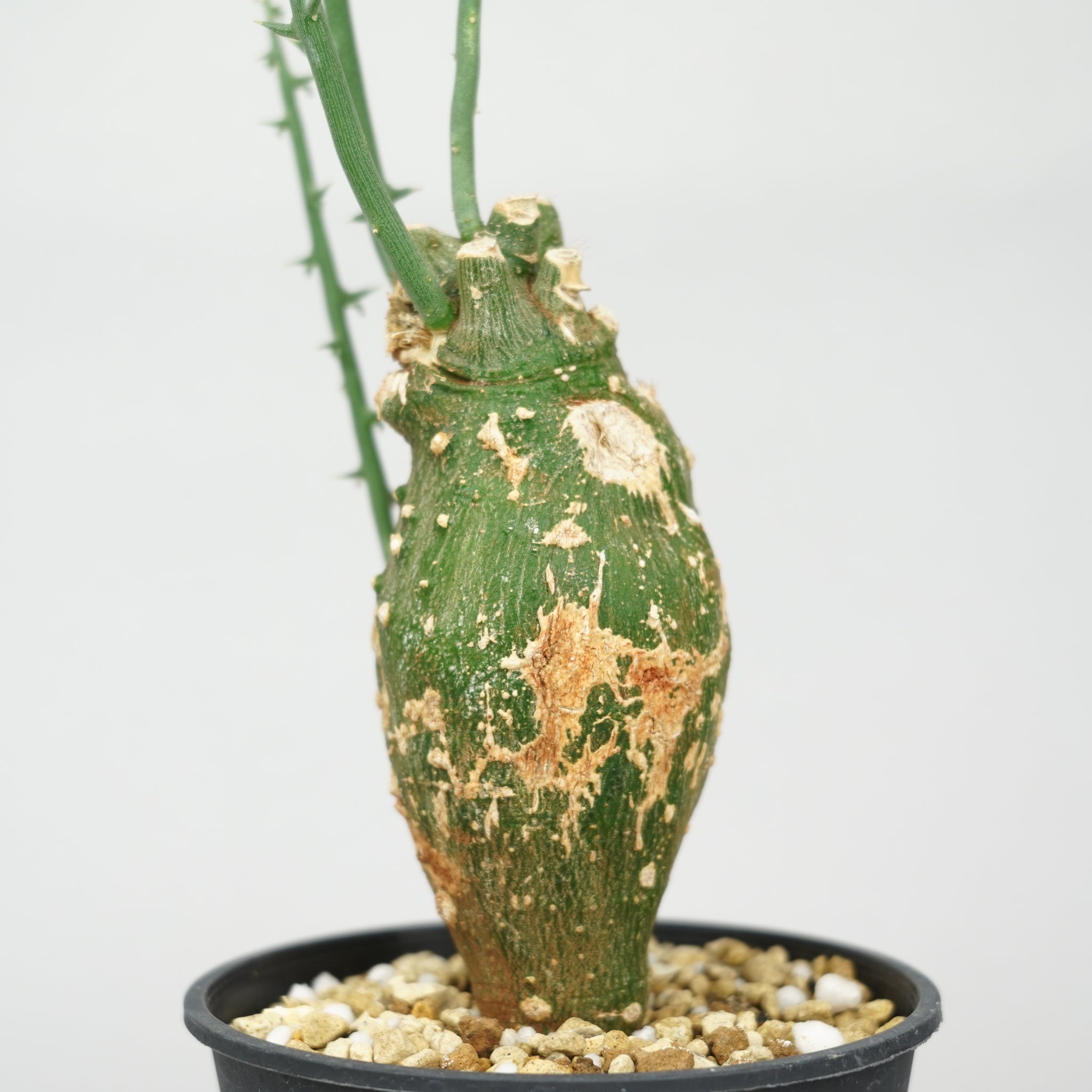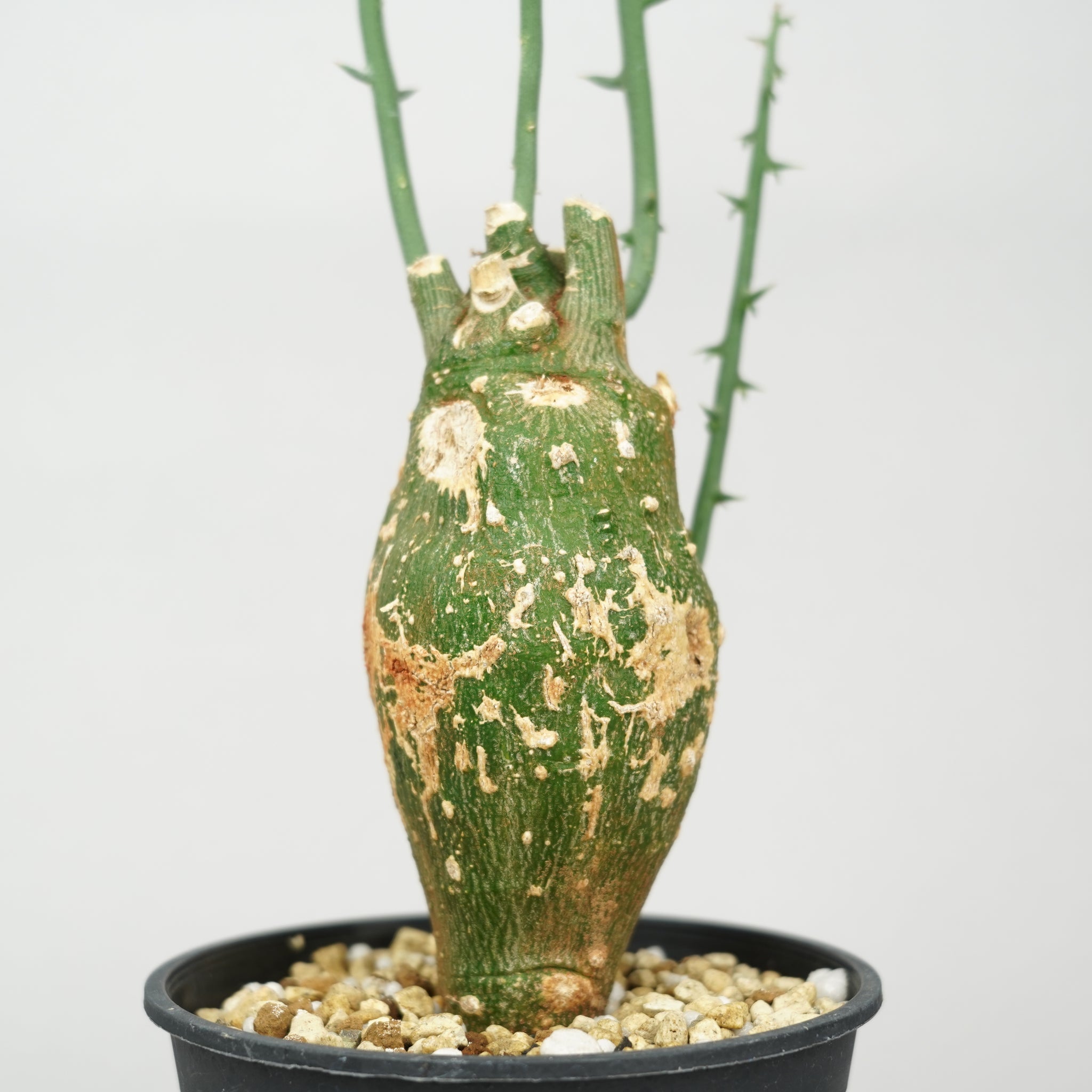 大きく丸みを帯びた塊根は重厚で、経年とともに表面の質感が増し、野性味ある風格へと育つ。塊根から立ち上がる枝は鋭く伸び、ワイルドで立体的なシルエットを形成。