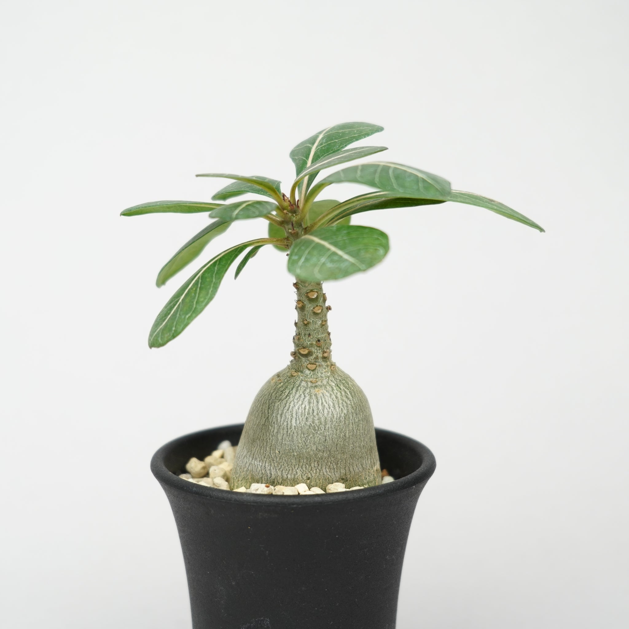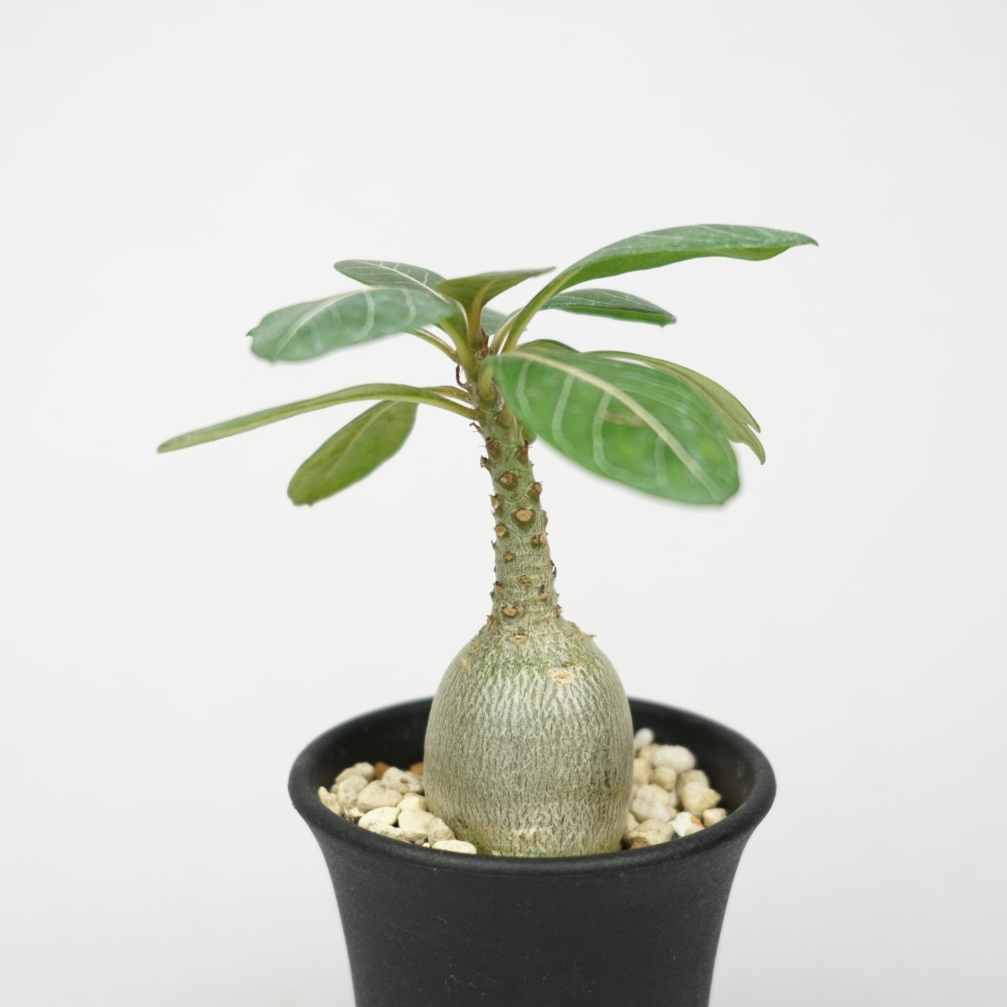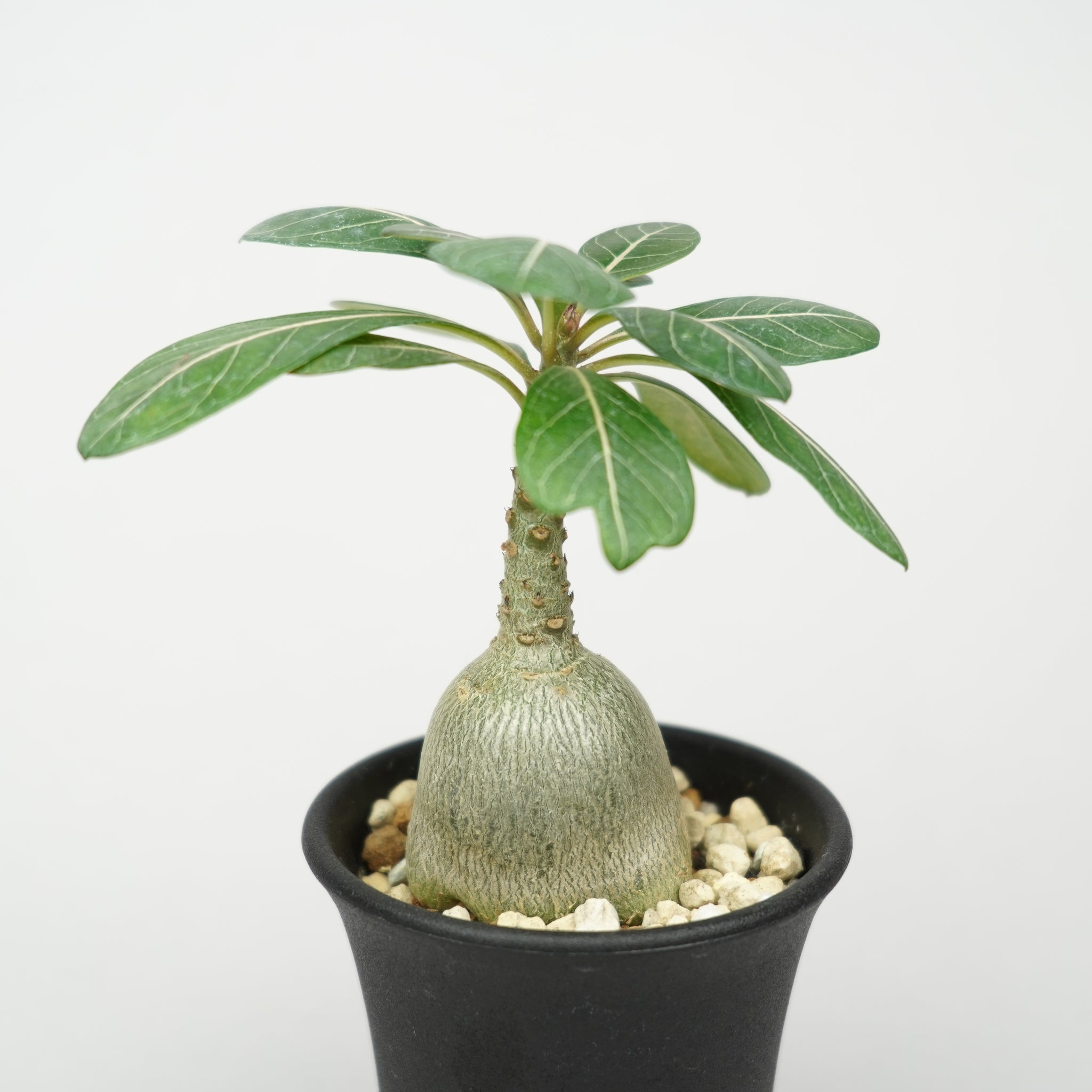 ボトル状に肥大する幹は、年月とともに重厚感を増し、彫刻的なシルエットへと進化。枝先に展開する肉厚の葉は、強い光を受けて鮮やかに輝き、ワイルドさの中に洗練された美しさを添えます。開花期には淡いピンク色の花を咲かせ、荒々しい幹とのコントラストが息をのむほど魅力的。