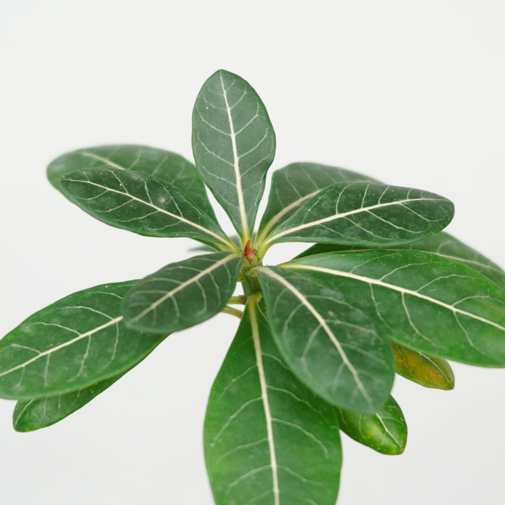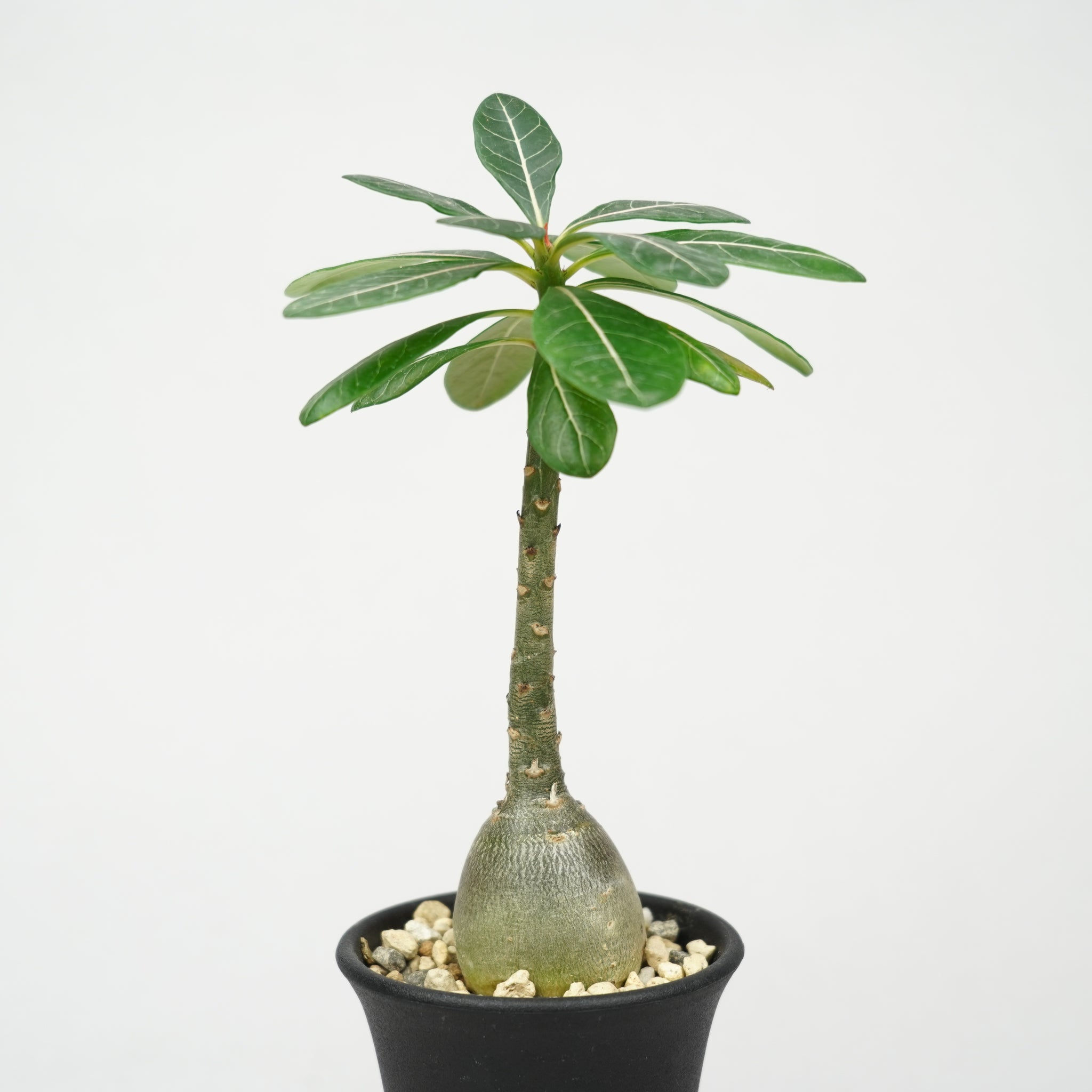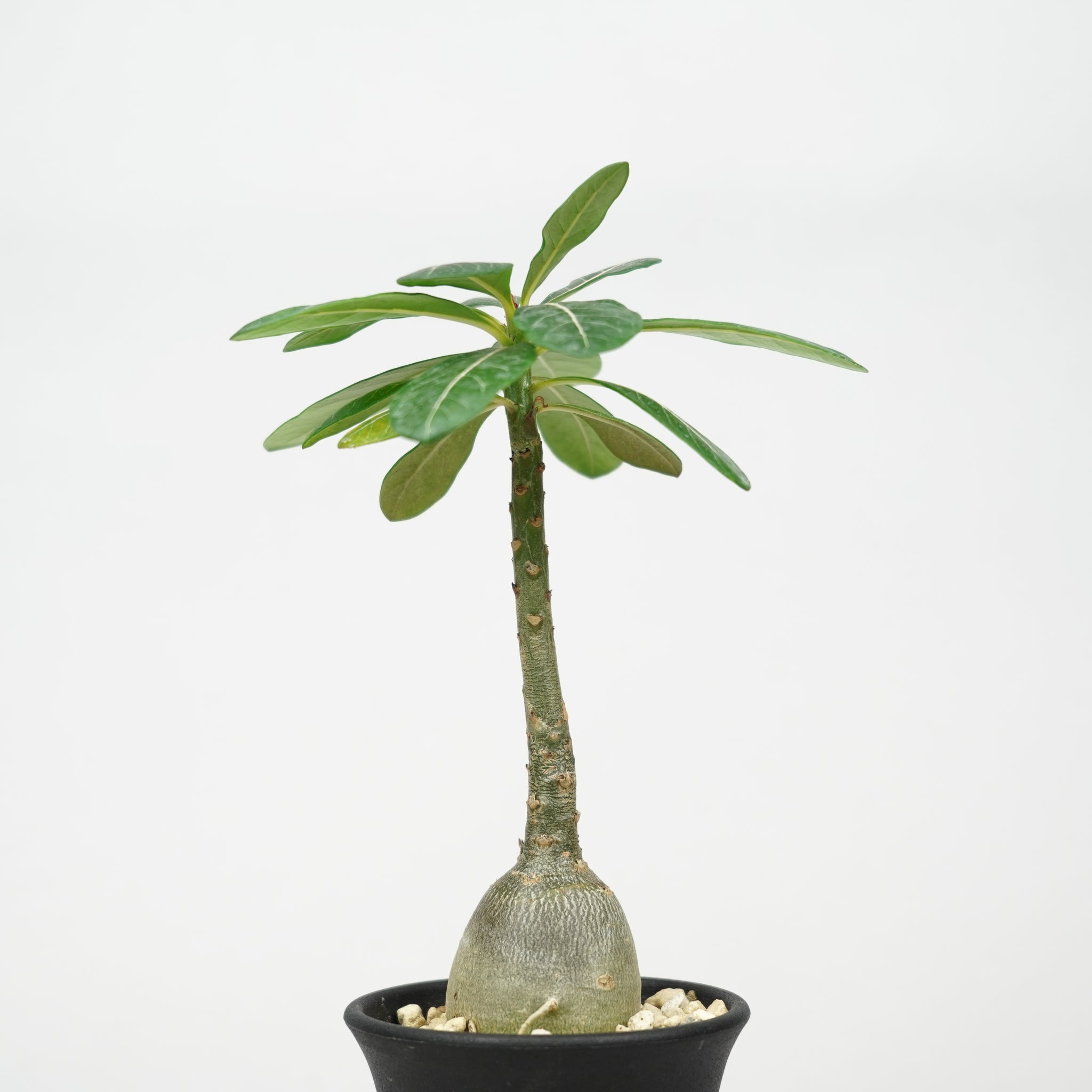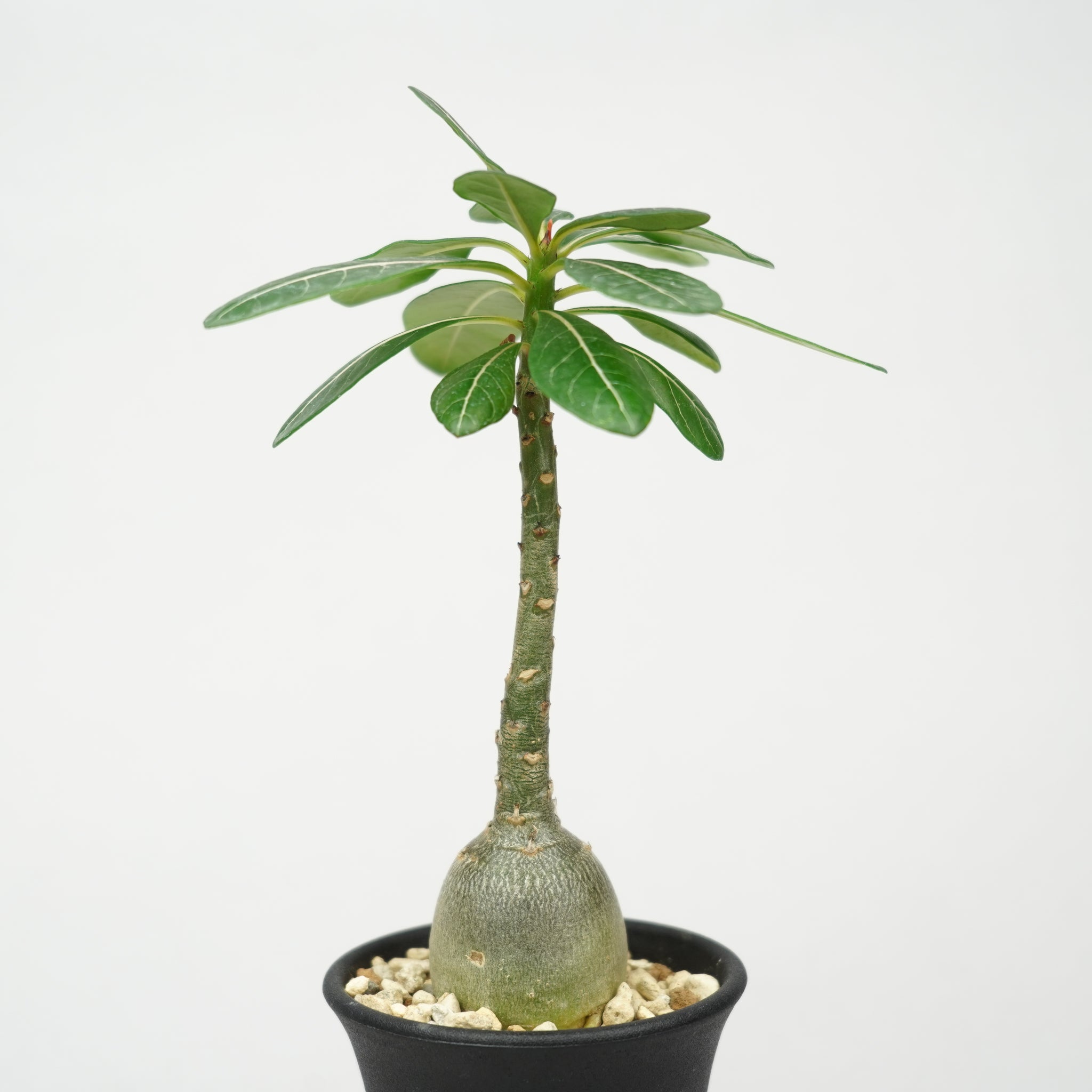 ボトル状に肥大する幹は、年月とともに重厚感を増し、彫刻的なシルエットへと進化。枝先に展開する肉厚の葉は、強い光を受けて鮮やかに輝き、ワイルドさの中に洗練された美しさを添えます。開花期には淡いピンク色の花を咲かせ、荒々しい幹とのコントラストが息をのむほど魅力的。