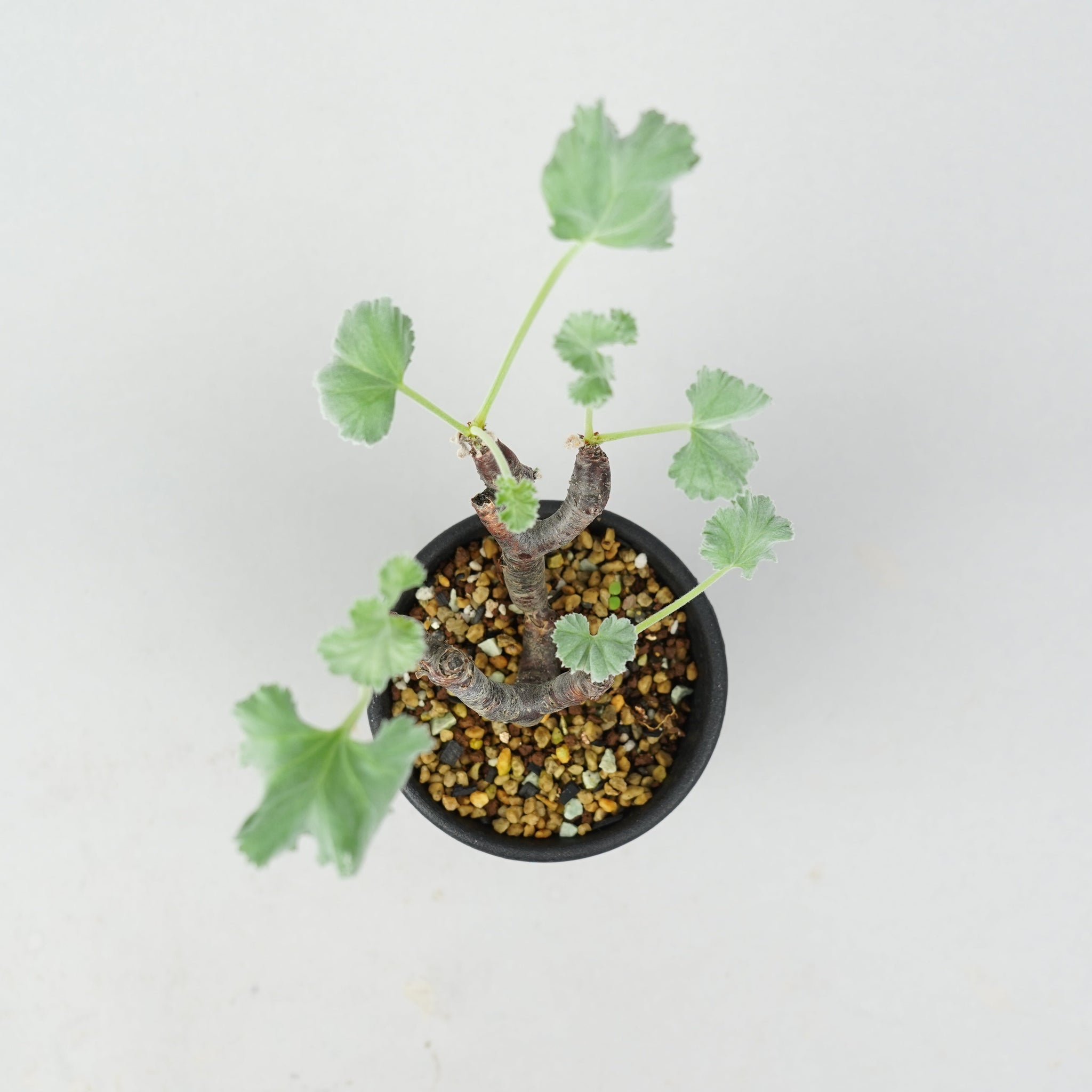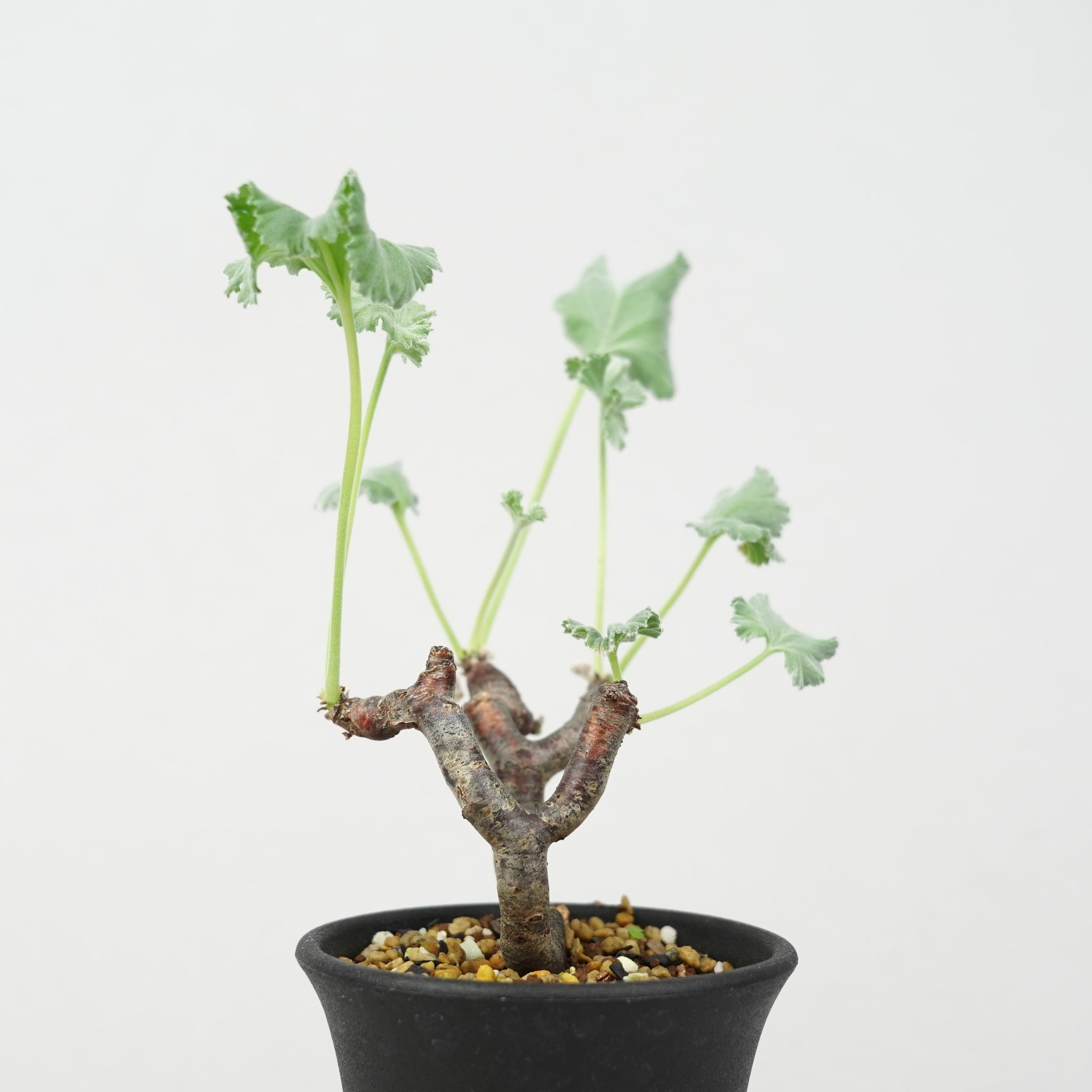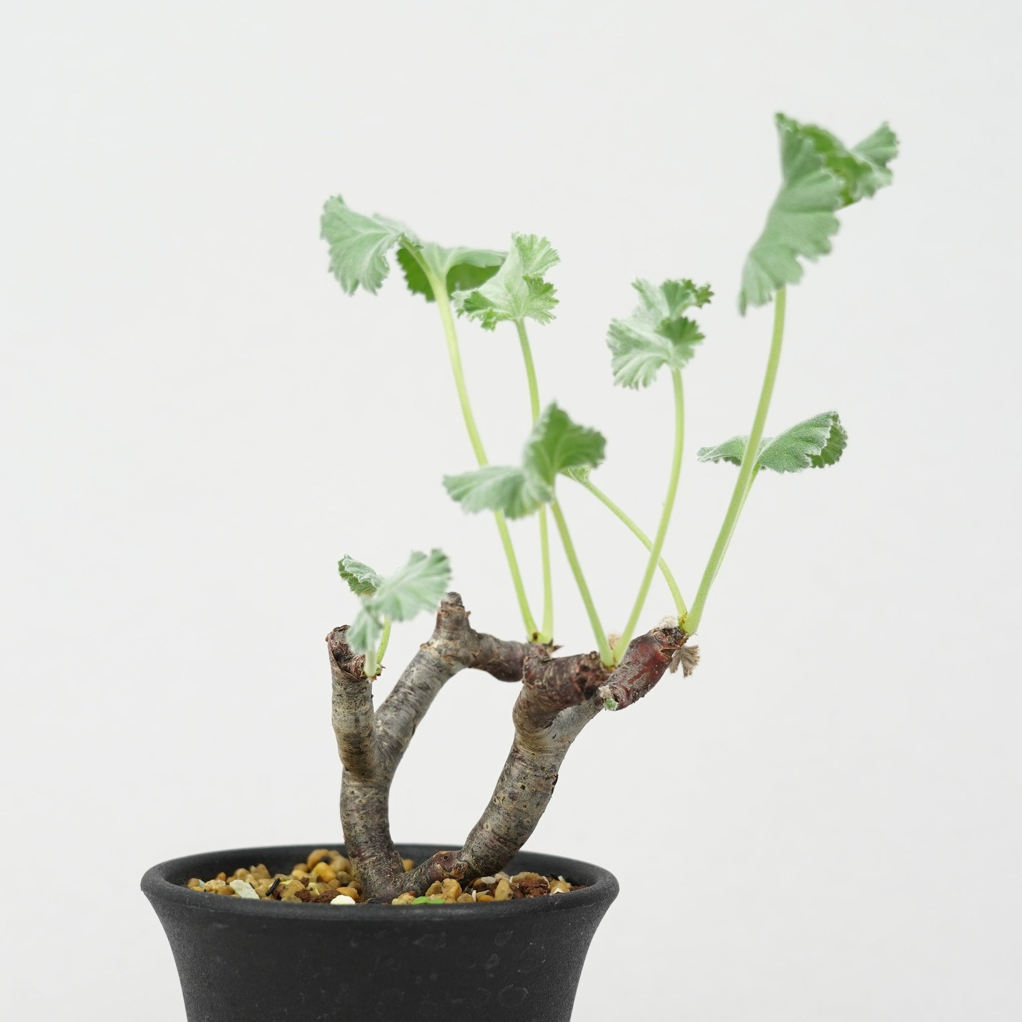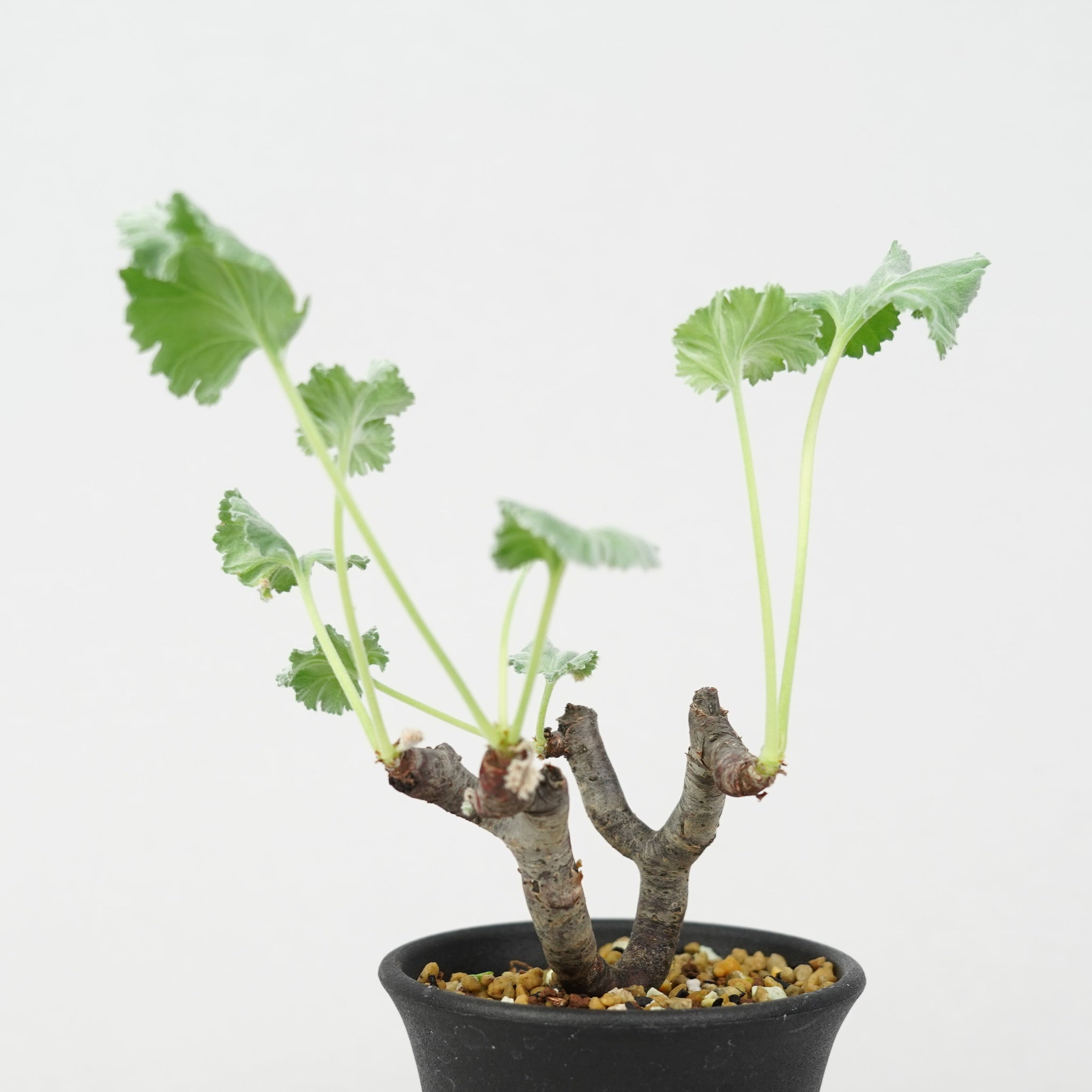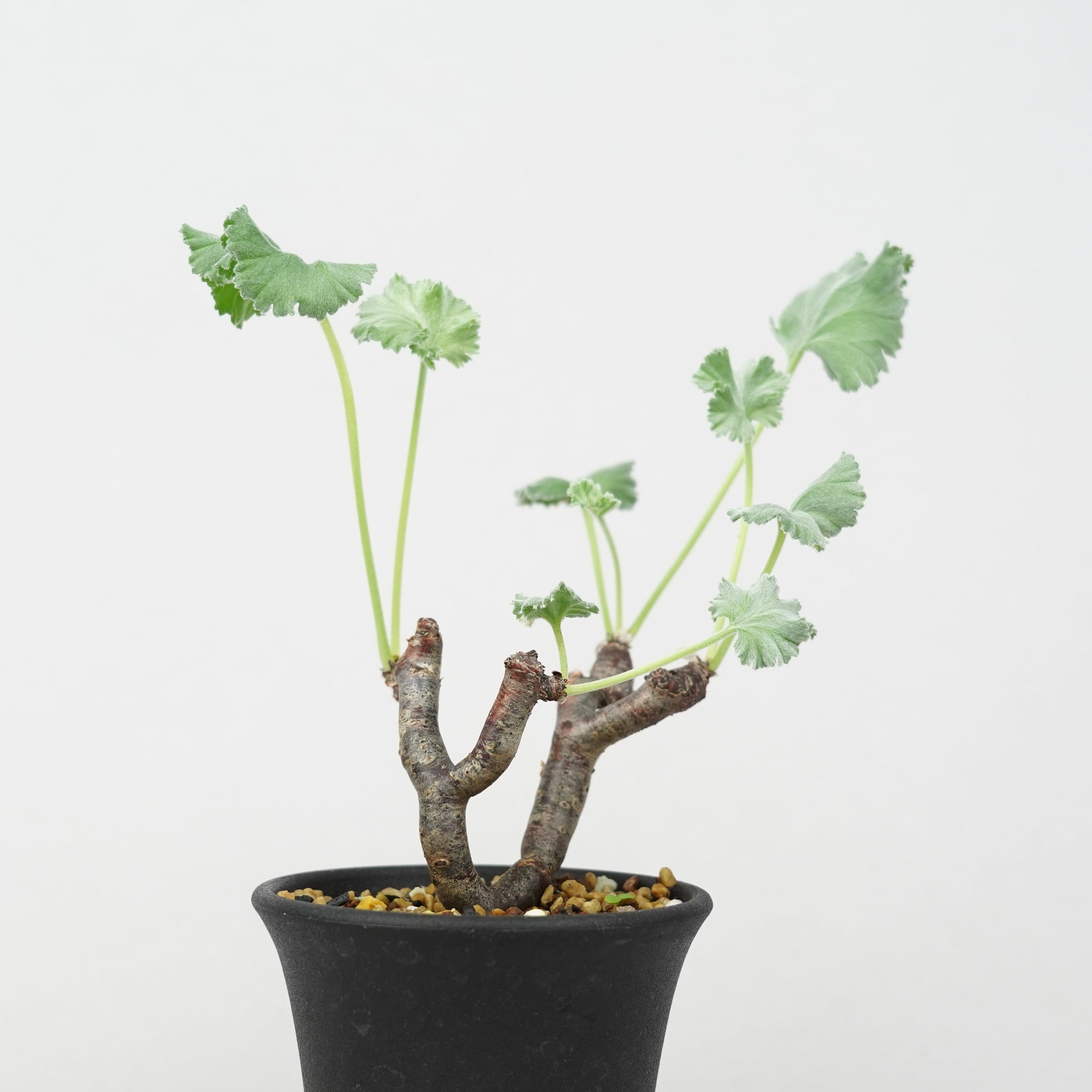 「ペラルゴニウム・ミラビレ」(Pelargonium mirabile)は、南アフリカ原産のフウロソウ科に属する希少な球根性植物です。ふっくらとした塊根と、繊細に切れ込みの入った葉が特徴で、柔らかなシルバーグリーンの色合いが上品な印象を与えます。静かな存在感の中に、力強い生命感を感じさせる美しいコーデックスです。