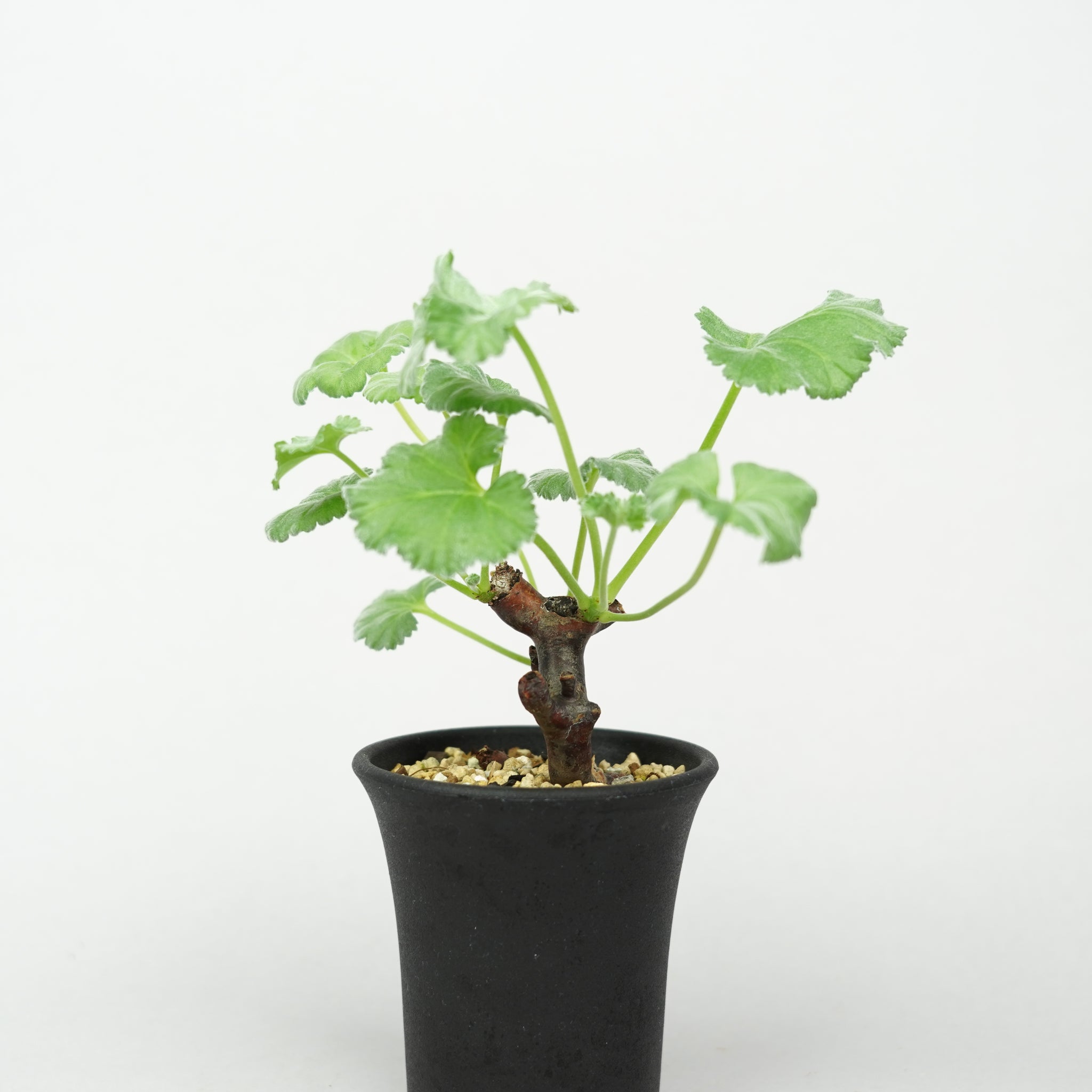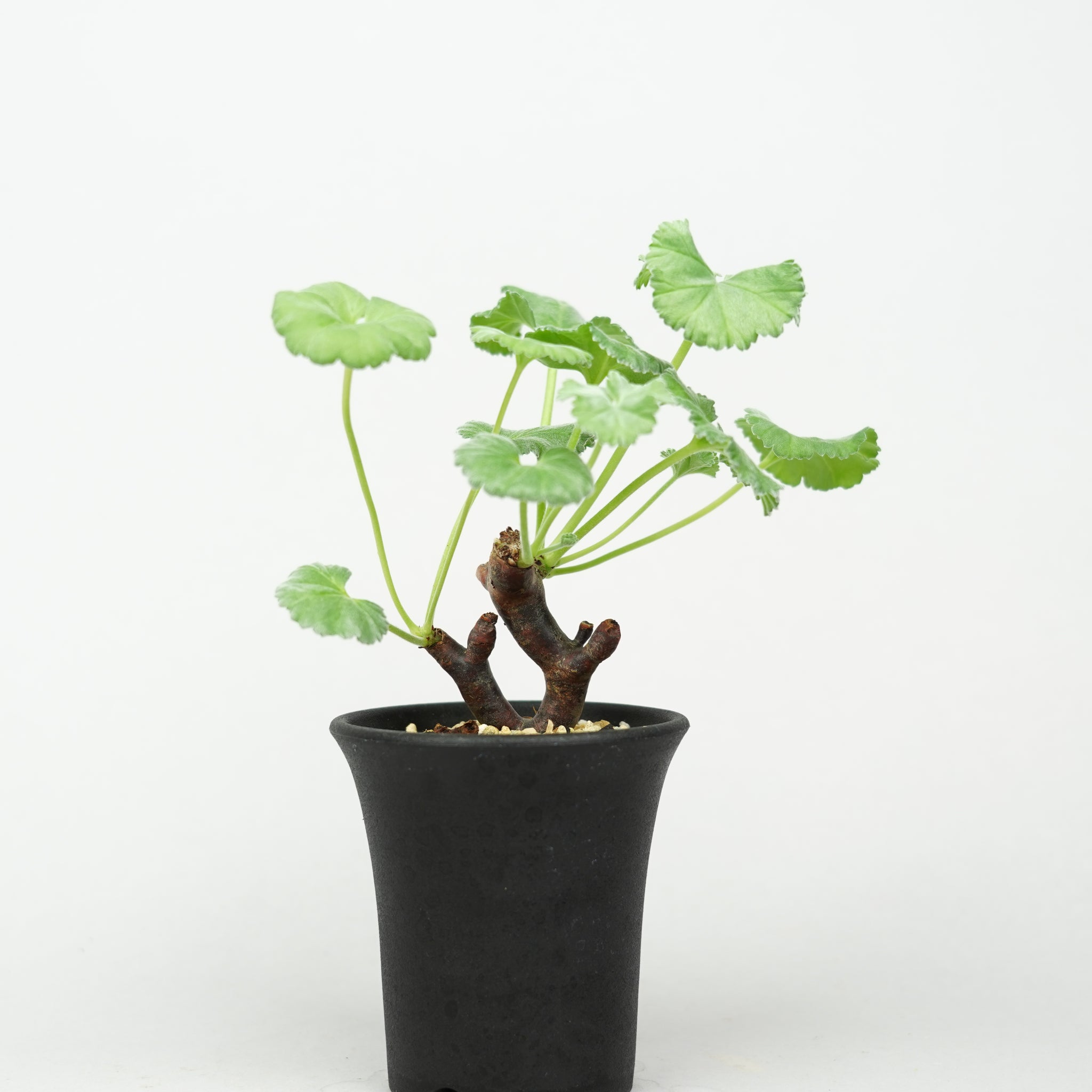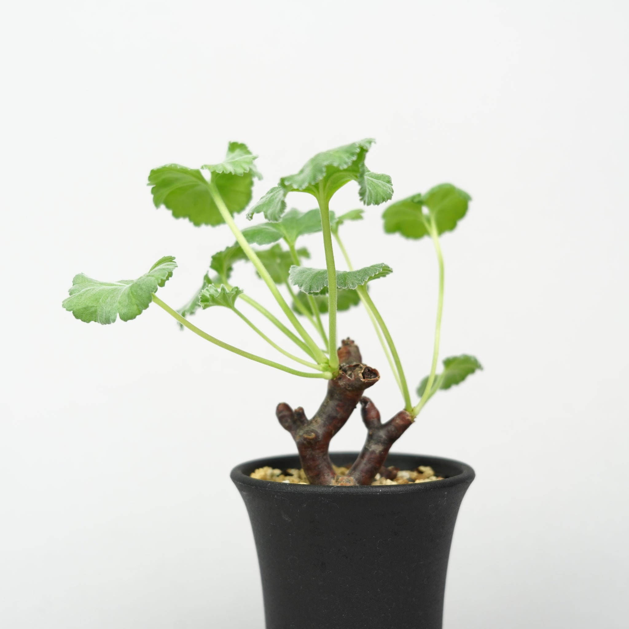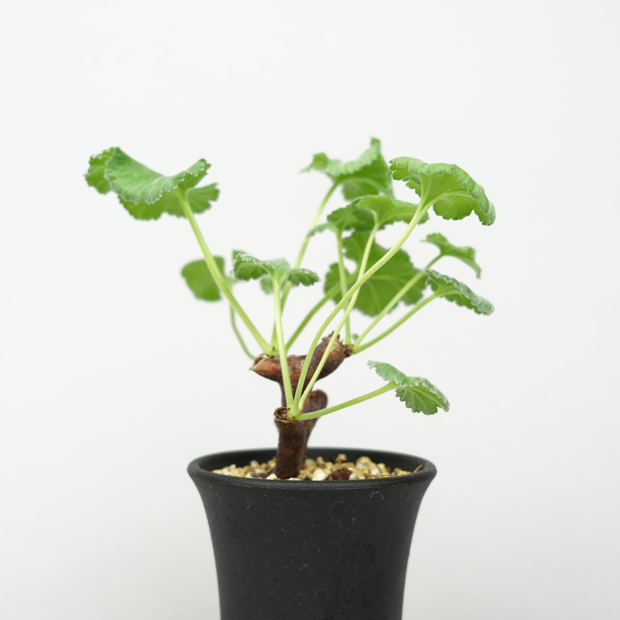 「ペラルゴニウム・ミラビレ」(Pelargonium mirabile)は、南アフリカ原産のフウロソウ科に属する希少な球根性植物です。ふっくらとした塊根と、繊細に切れ込みの入った葉が特徴で、柔らかなシルバーグリーンの色合いが上品な印象を与えます。静かな存在感の中に、力強い生命感を感じさせる美しいコーデックスです。