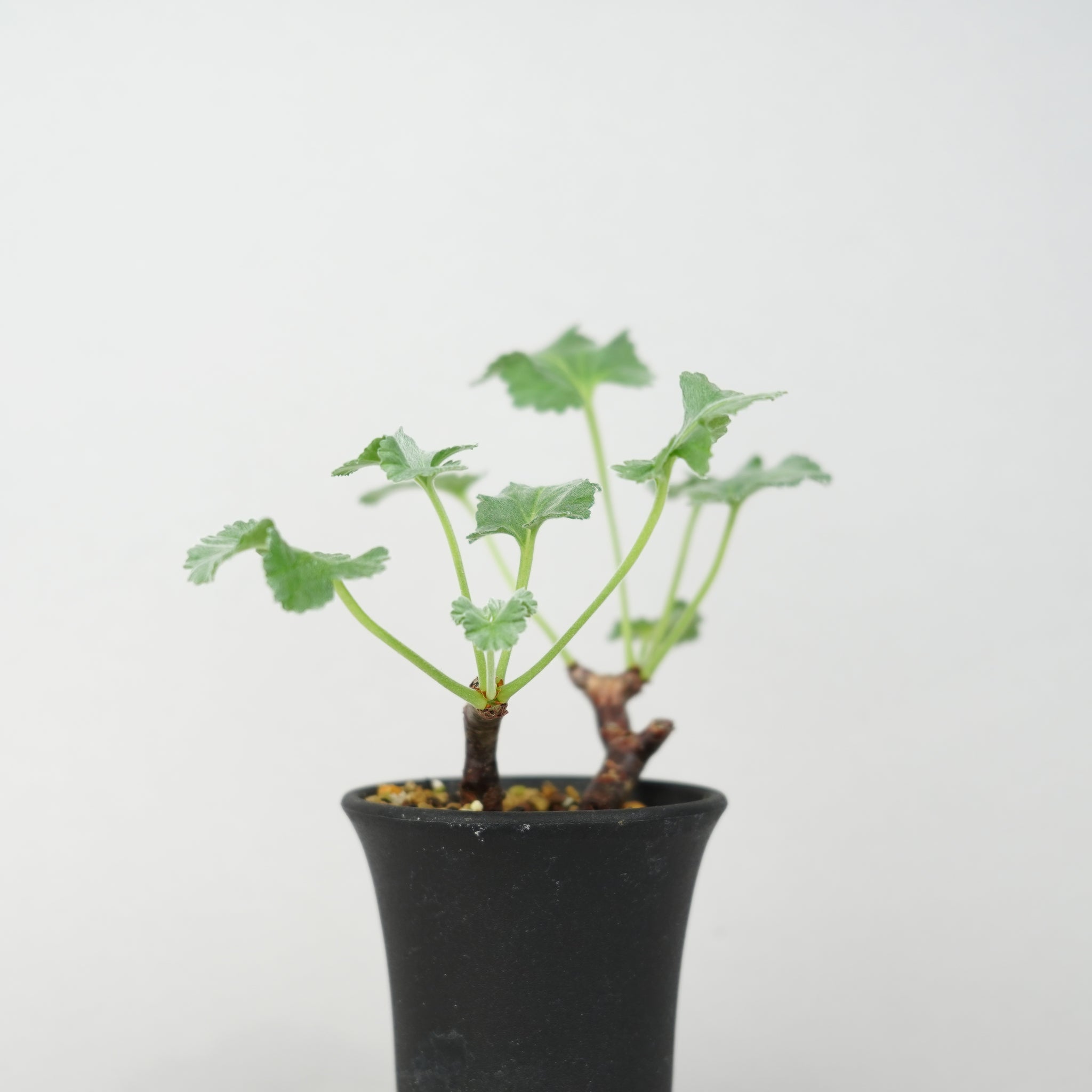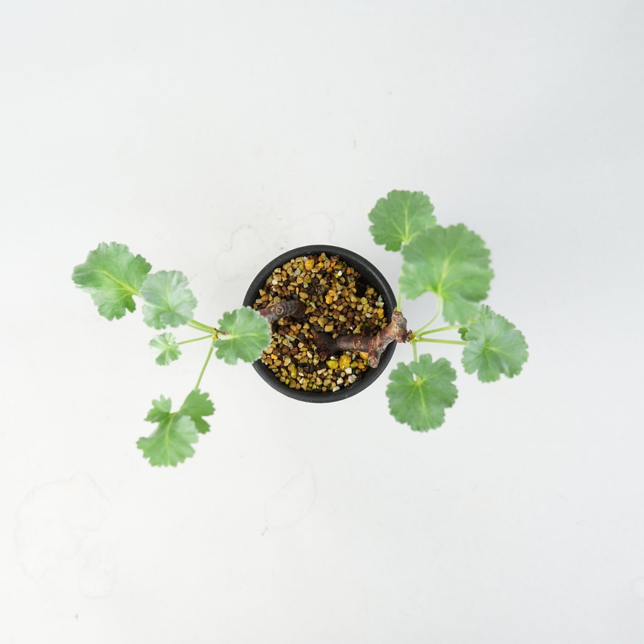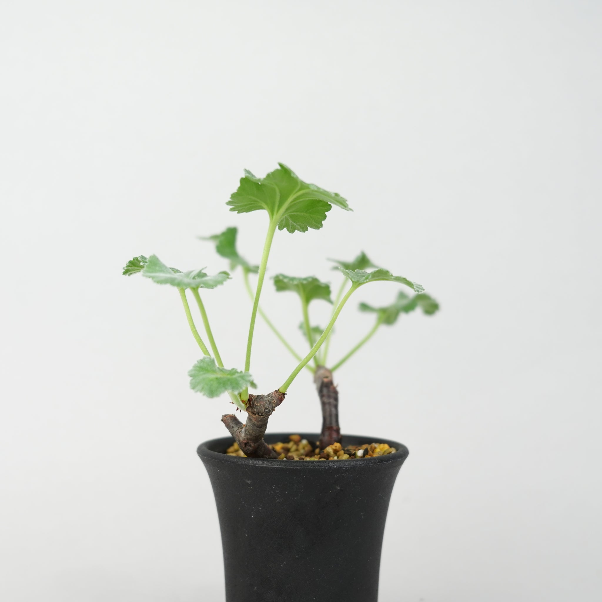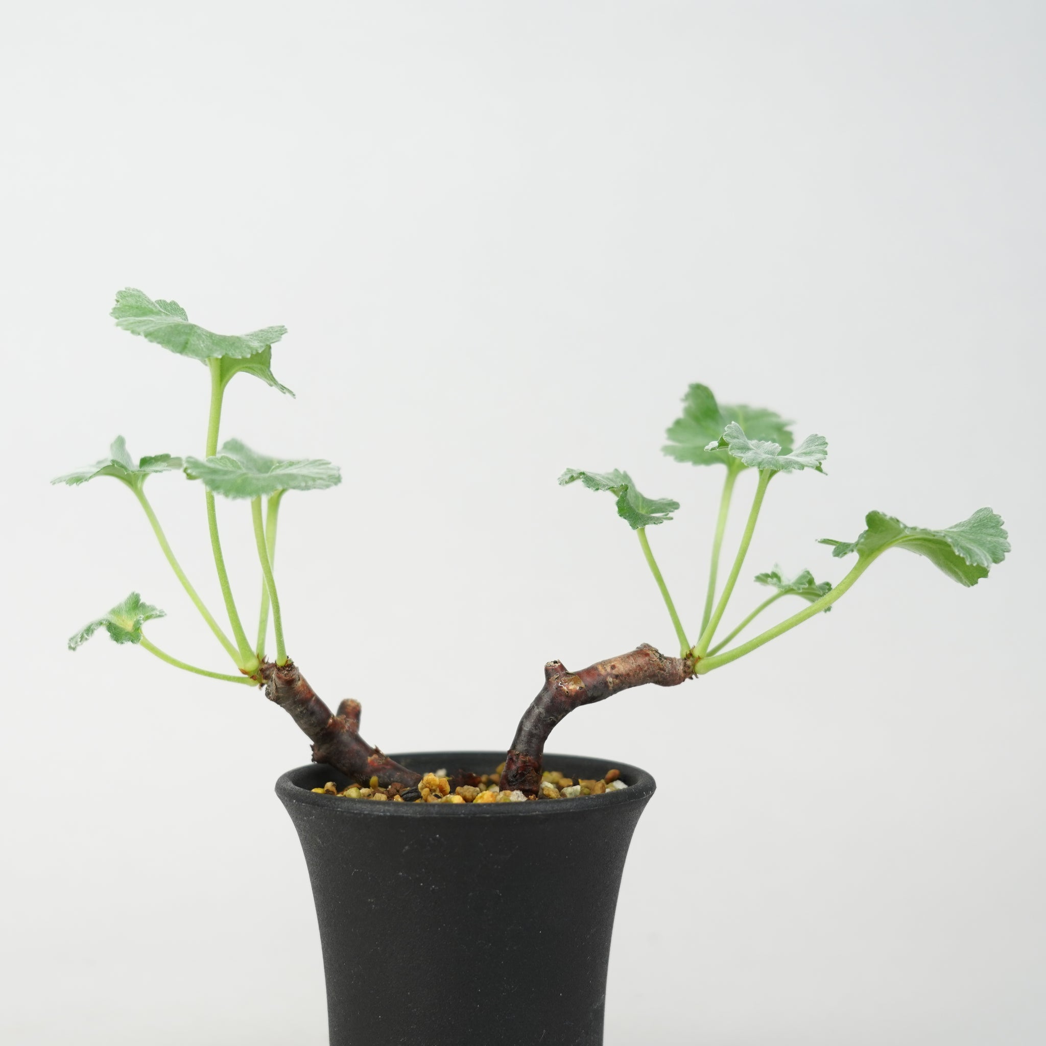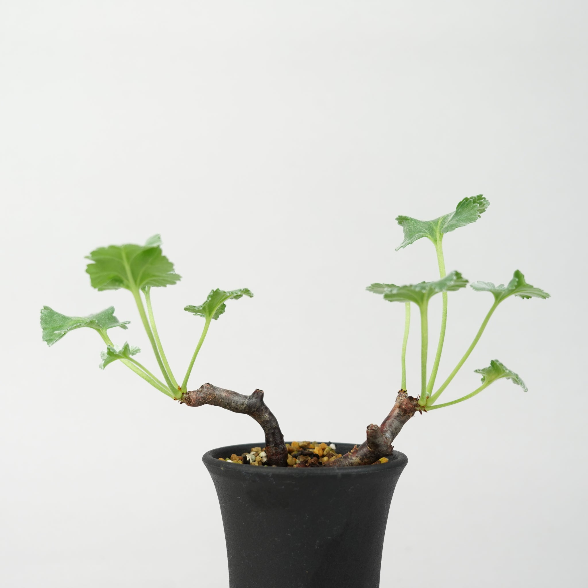 「ペラルゴニウム・ミラビレ」(Pelargonium mirabile)は、南アフリカ原産のフウロソウ科に属する希少な球根性植物です。ふっくらとした塊根と、繊細に切れ込みの入った葉が特徴で、柔らかなシルバーグリーンの色合いが上品な印象を与えます。静かな存在感の中に、力強い生命感を感じさせる美しいコーデックスです。