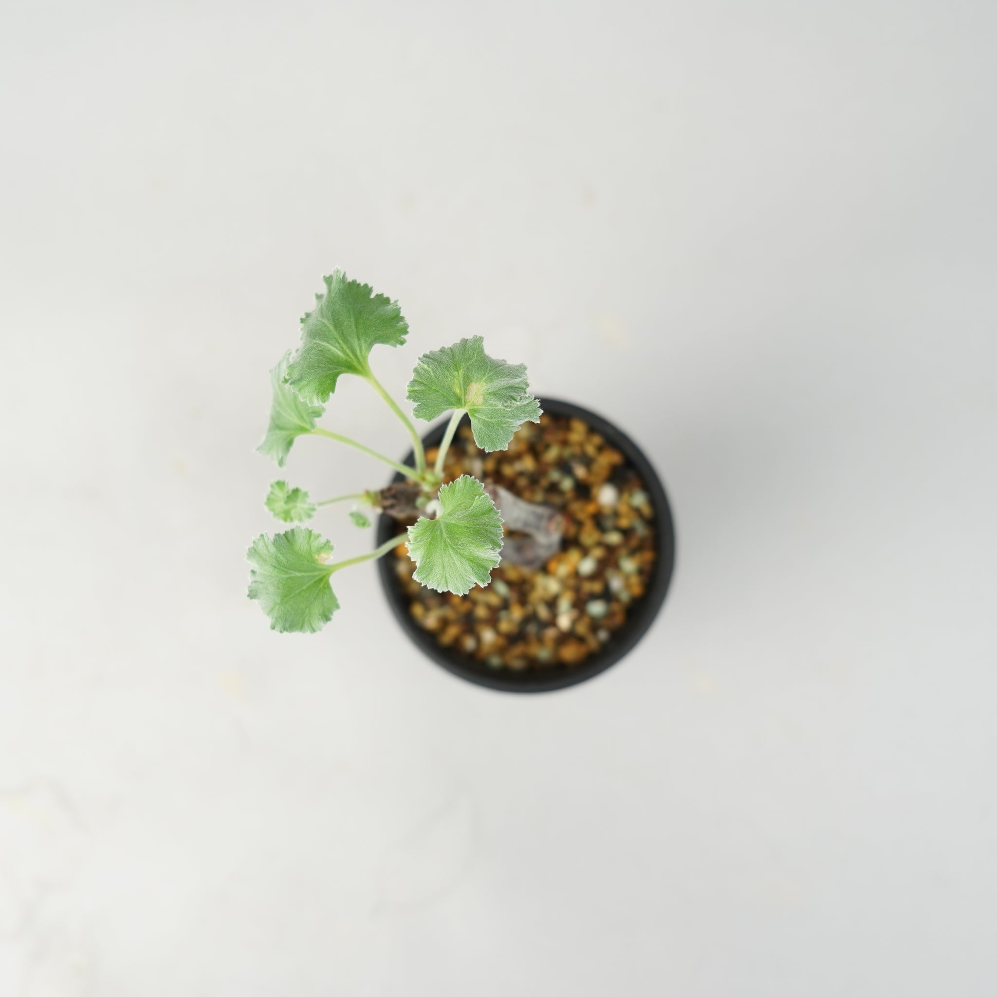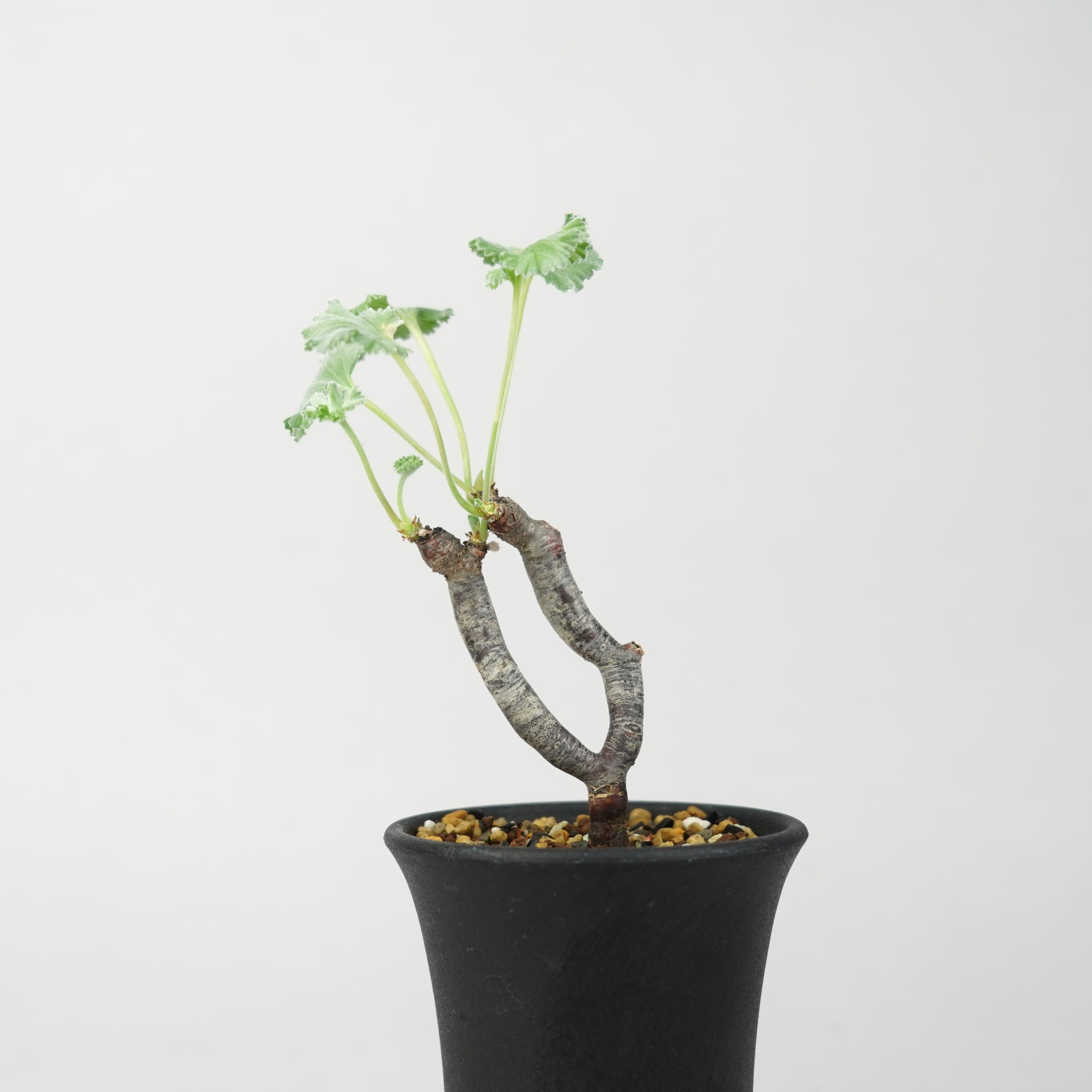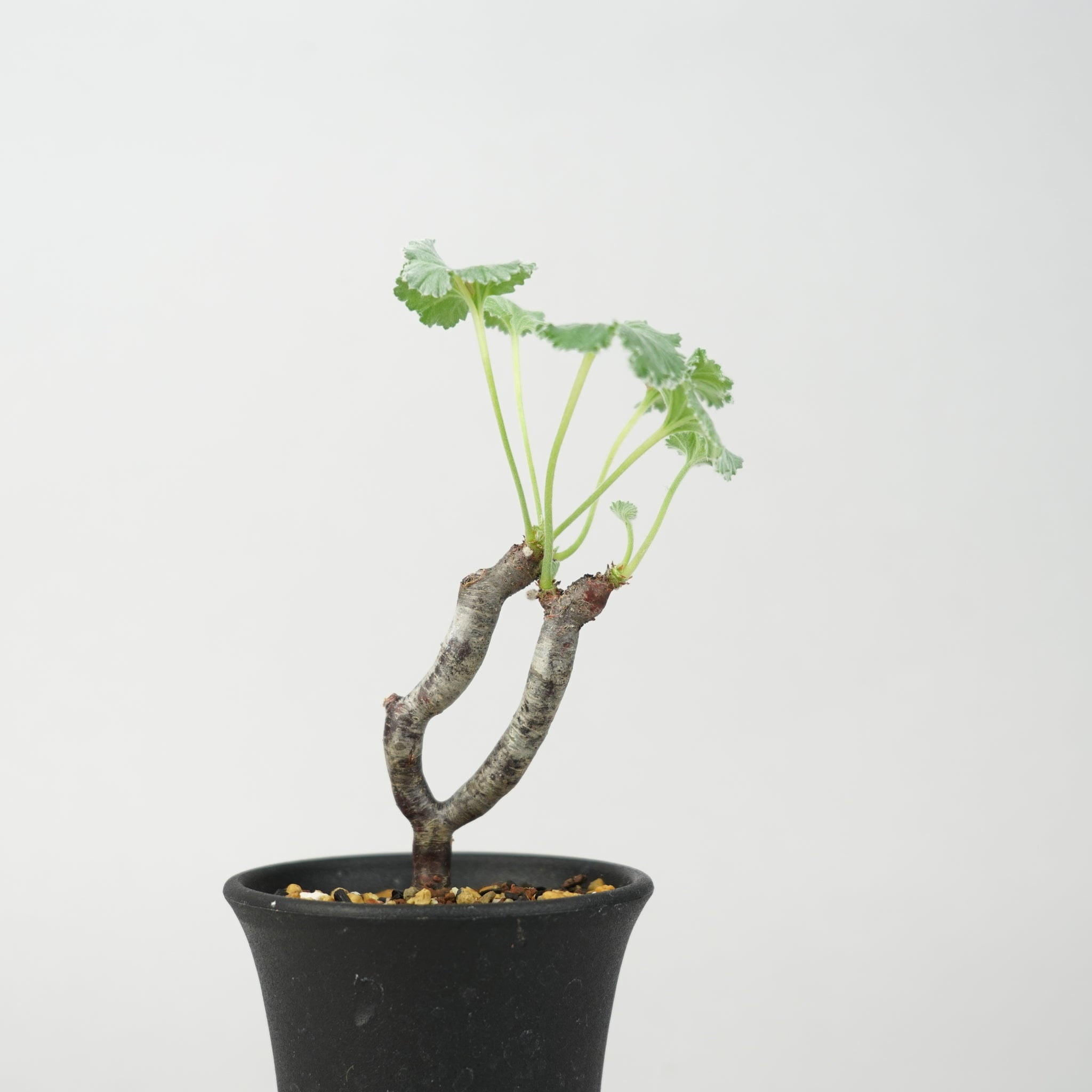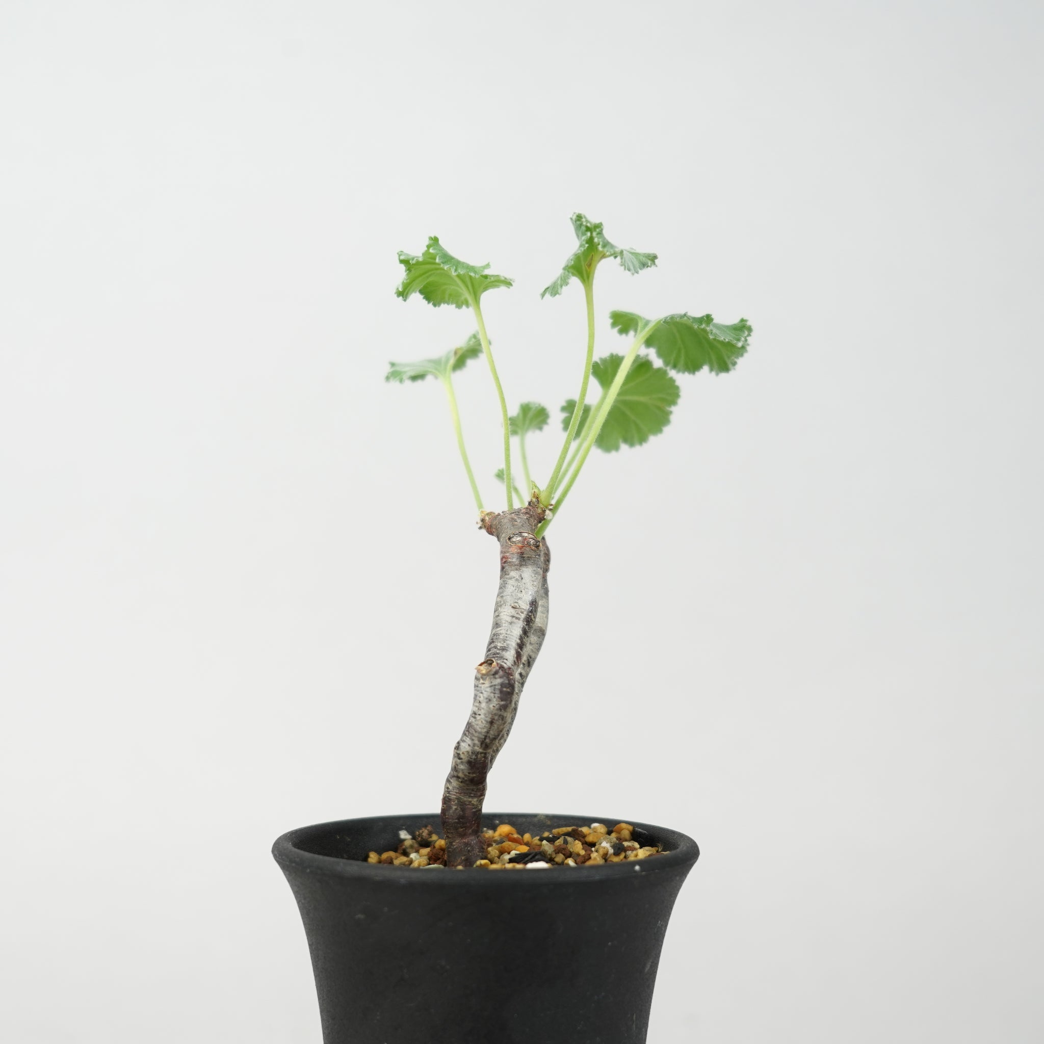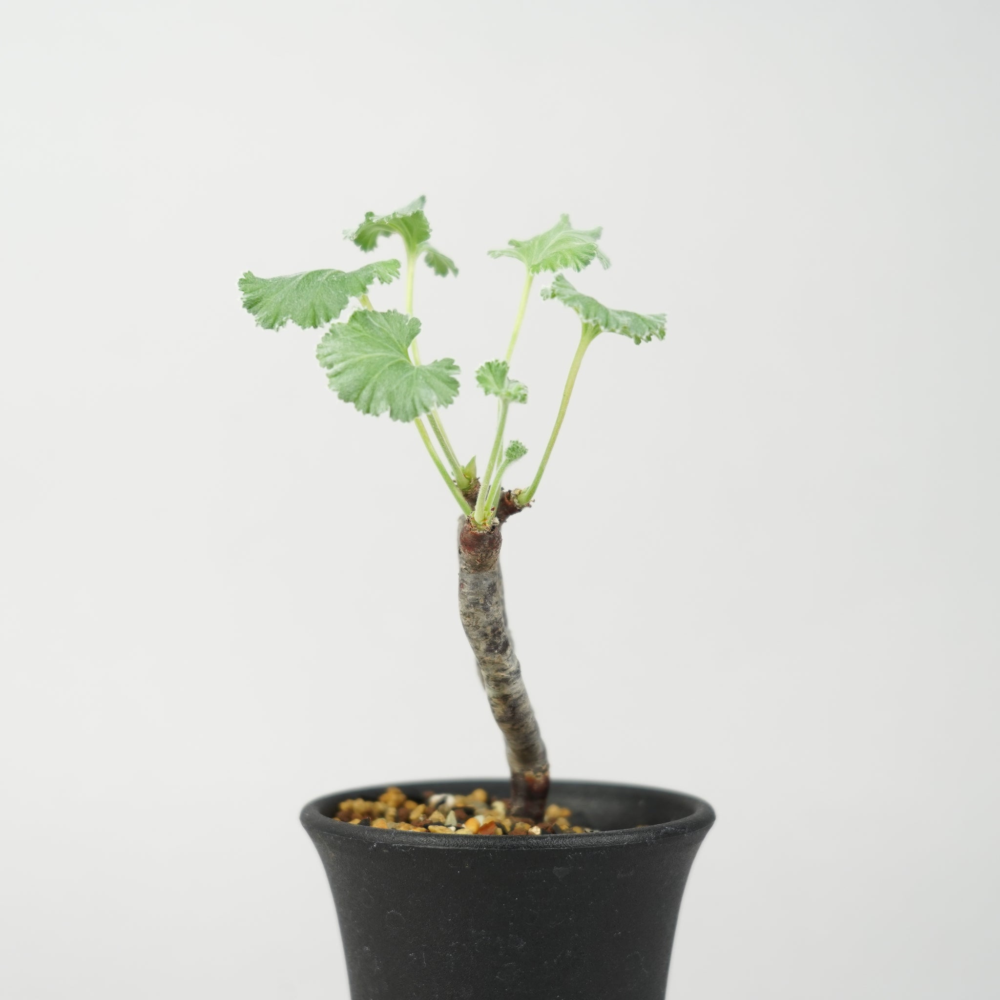 「ペラルゴニウム・ミラビレ」(Pelargonium mirabile)は、南アフリカ原産のフウロソウ科に属する希少な球根性植物です。ふっくらとした塊根と、繊細に切れ込みの入った葉が特徴で、柔らかなシルバーグリーンの色合いが上品な印象を与えます。静かな存在感の中に、力強い生命感を感じさせる美しいコーデックスです。