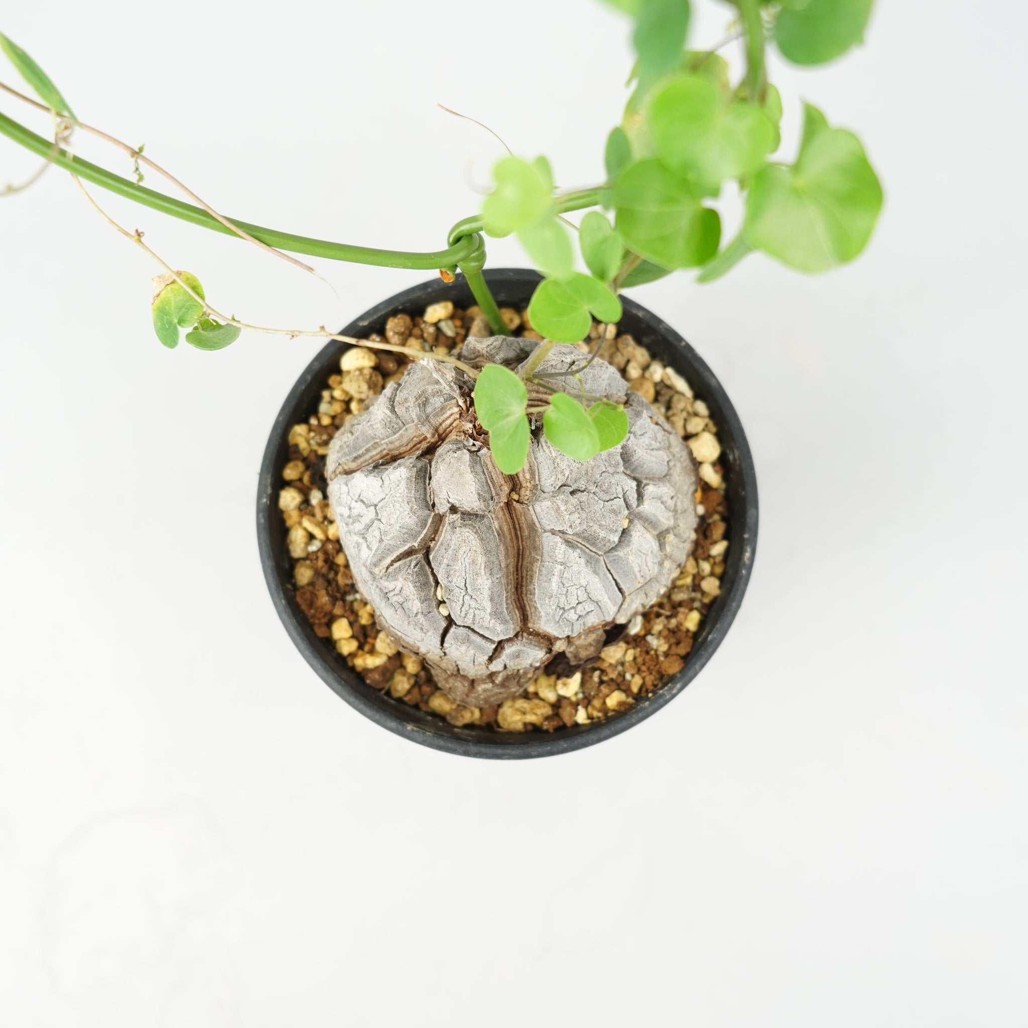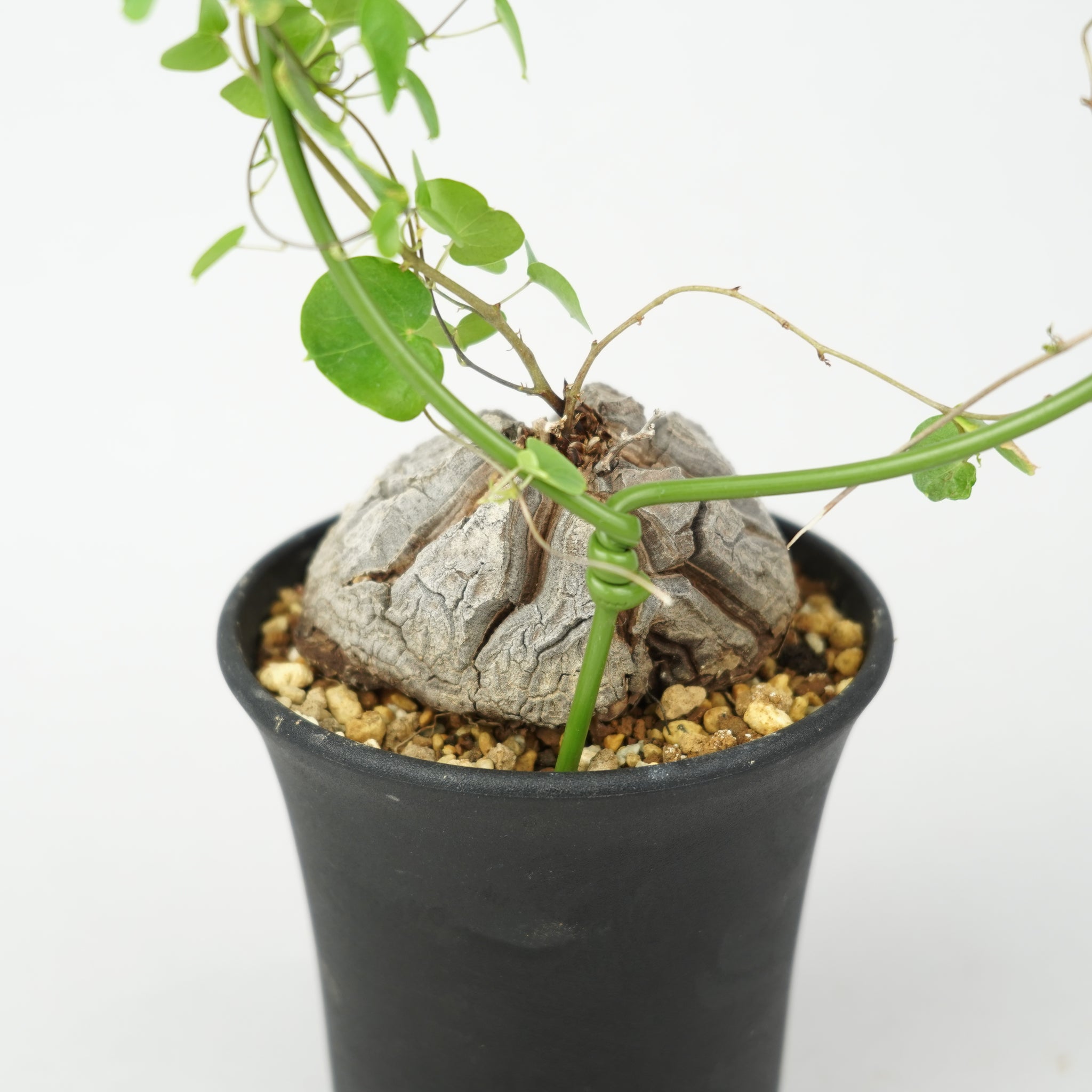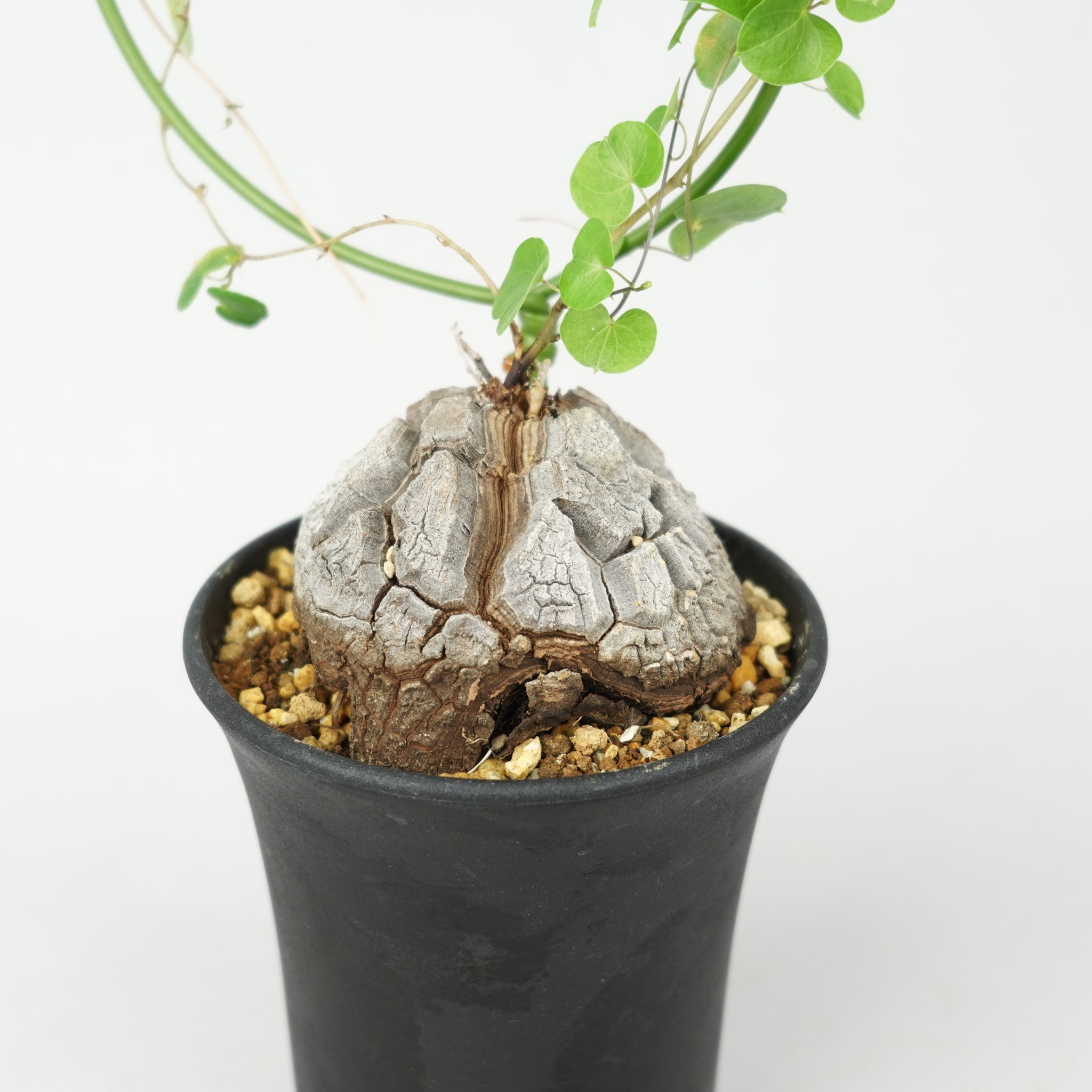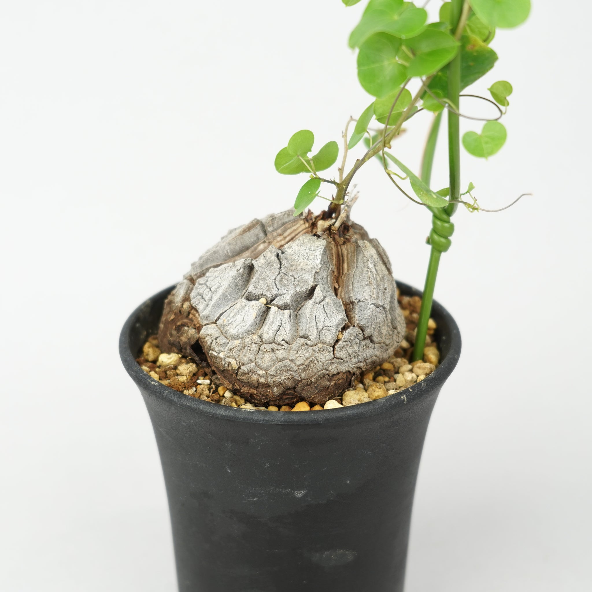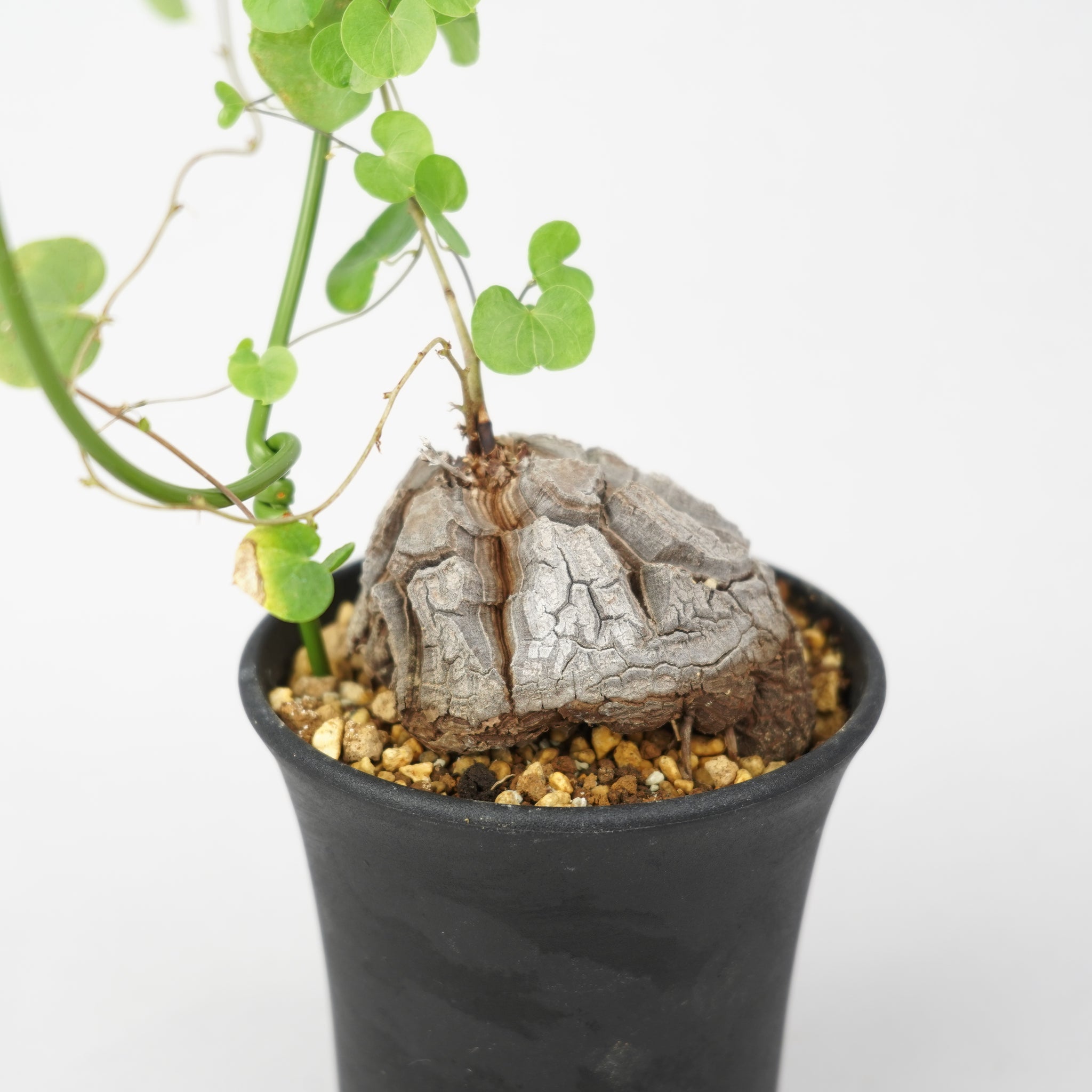 塊根から伸びるツル状の枝にはハート型の葉をつけ、その可憐なフォルムとの対比が独特の魅力を生み出します。
