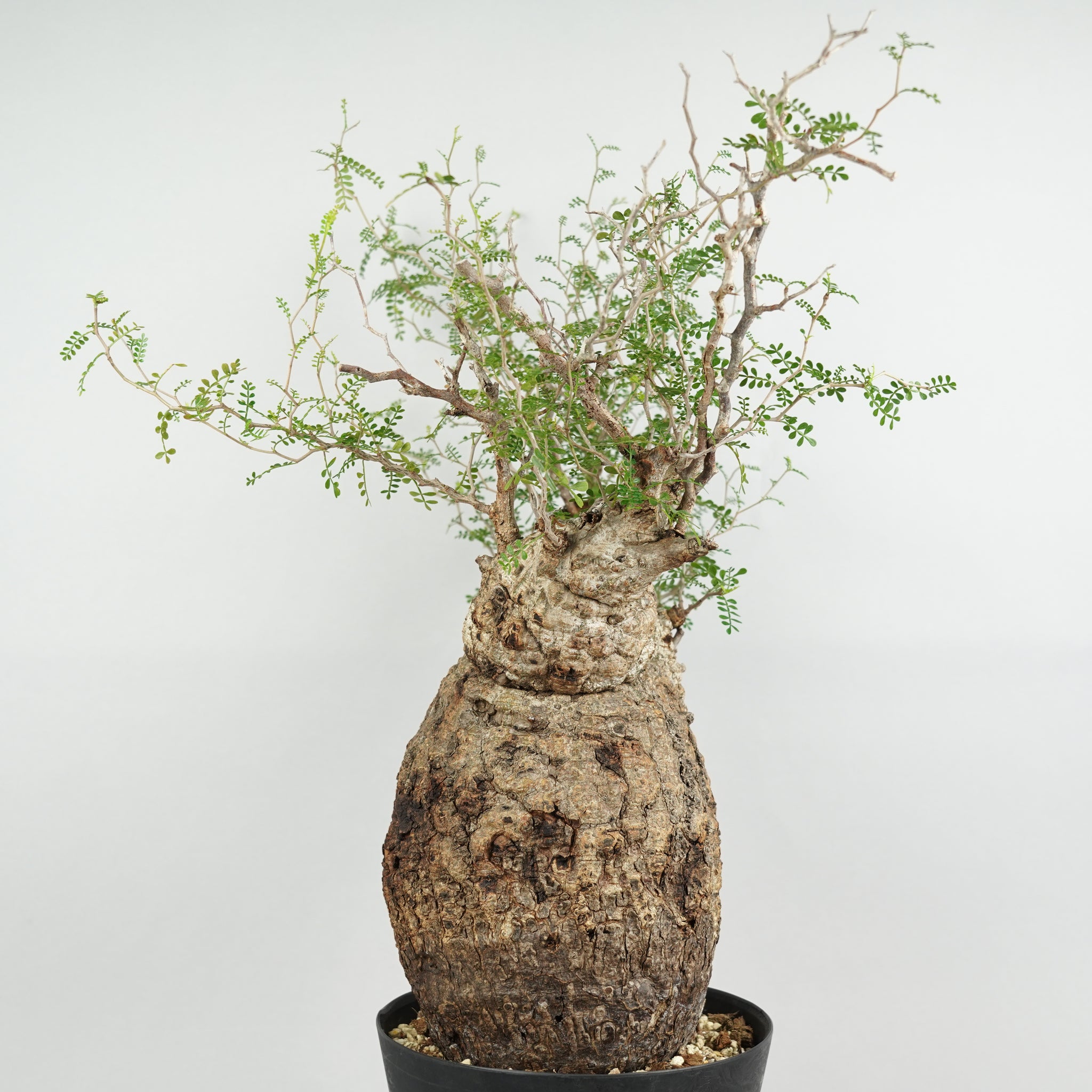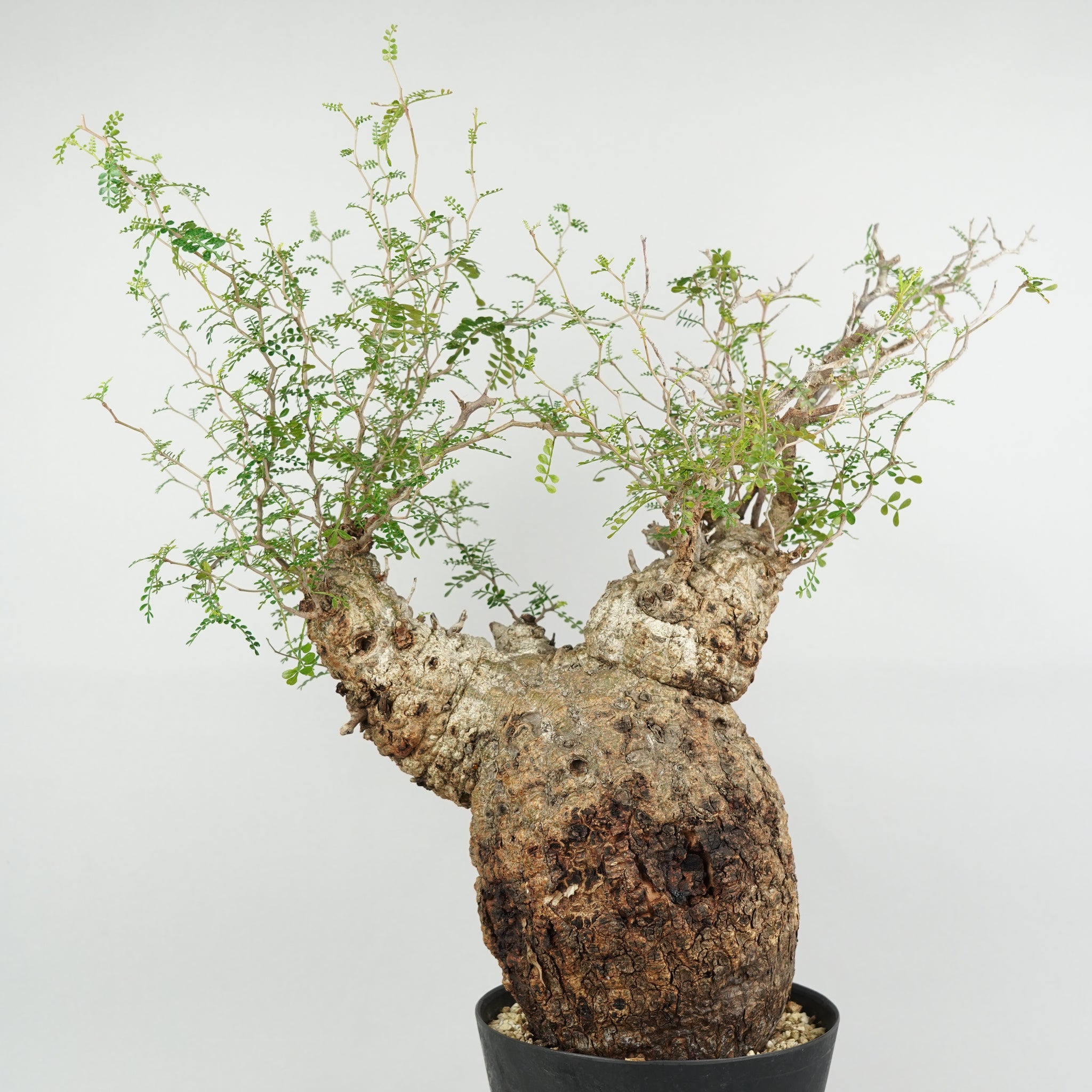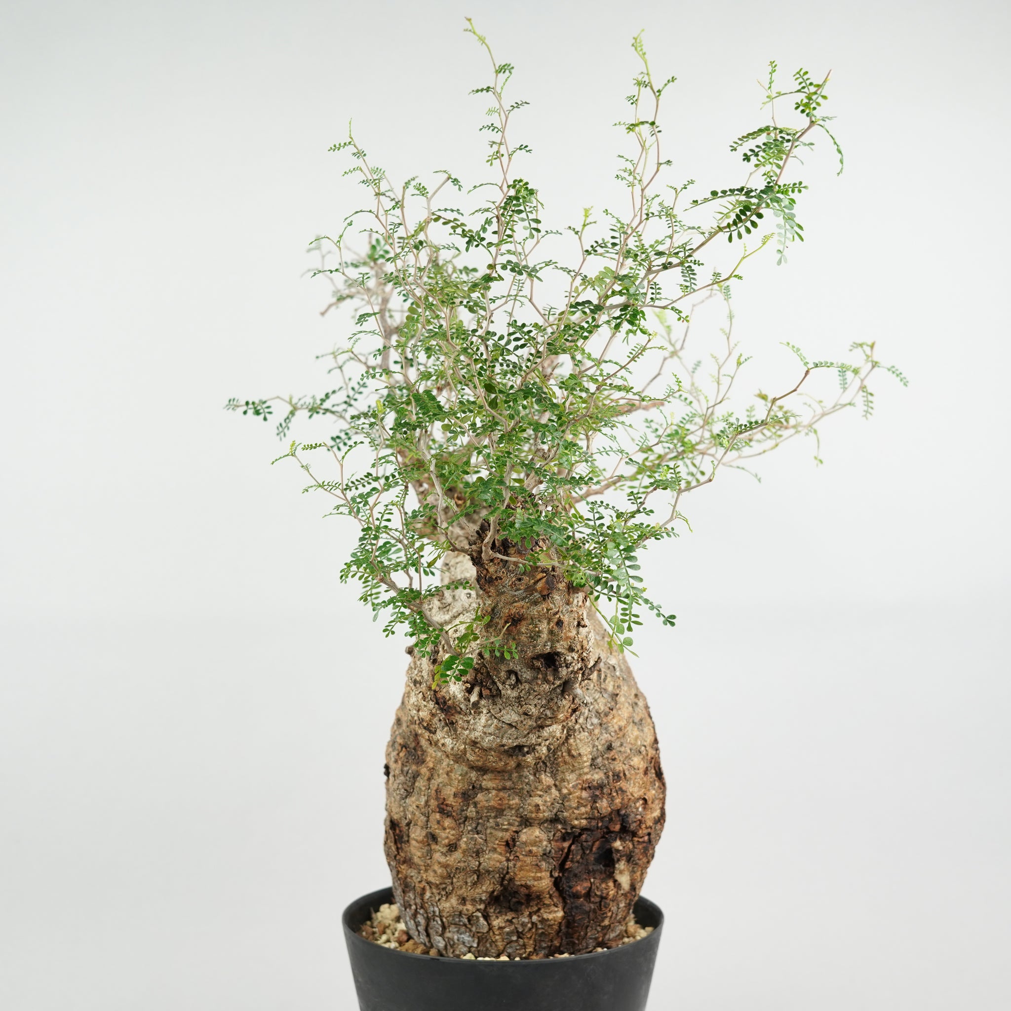 太く力強い幹と、そこから繊細に伸びる枝葉のコントラストが美しく、「塊根植物の王様」とも称される存在です。