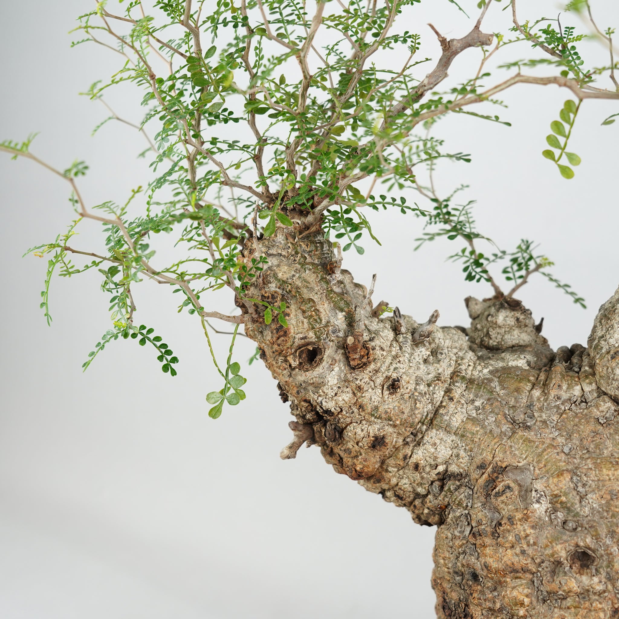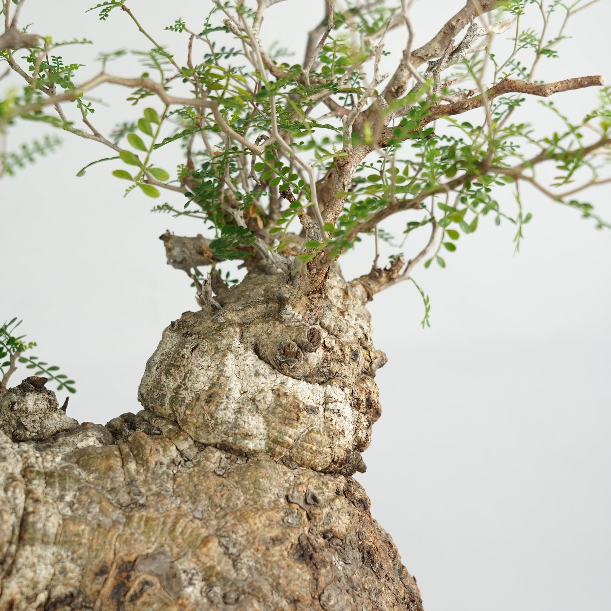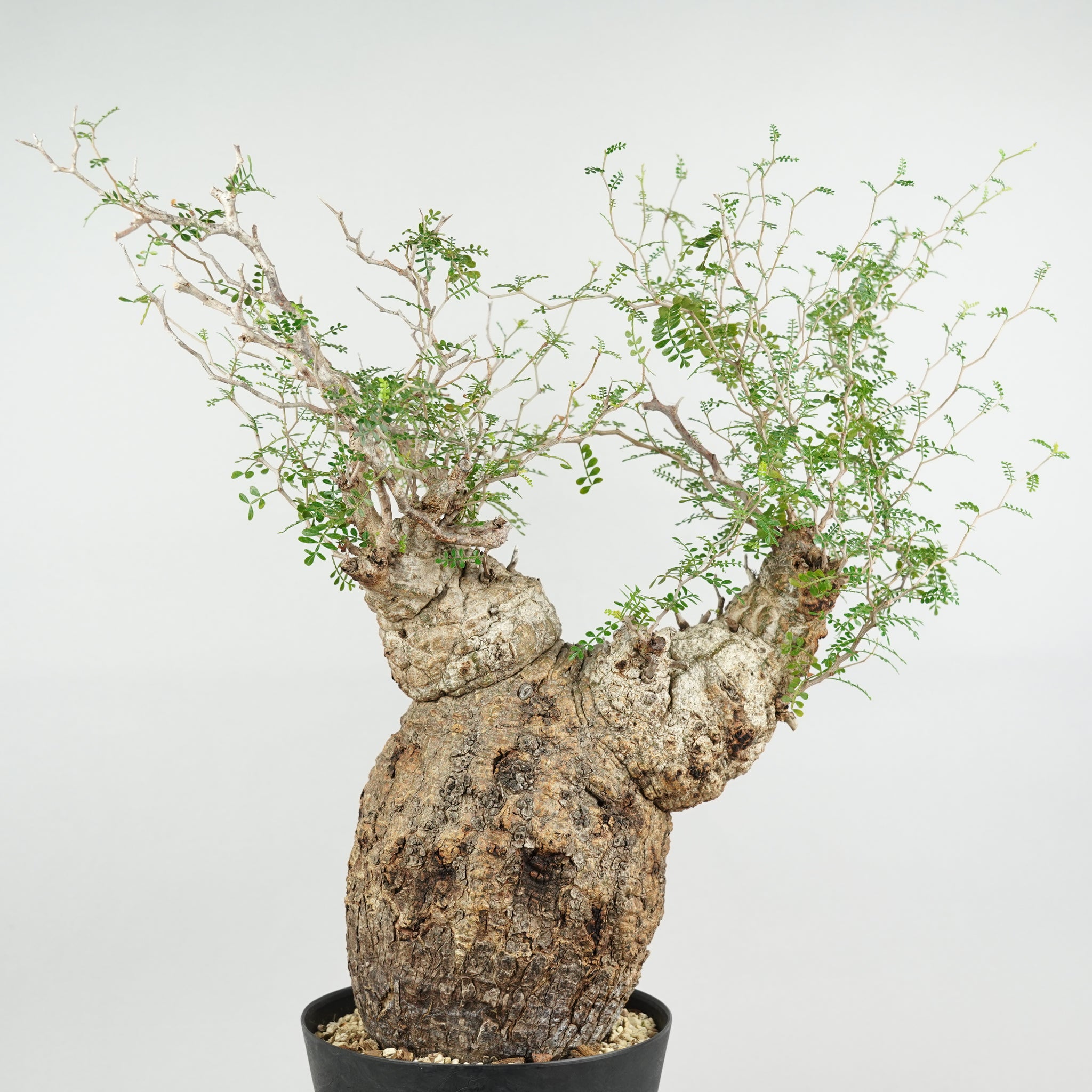 太く力強い幹と、そこから繊細に伸びる枝葉のコントラストが美しく、「塊根植物の王様」とも称される存在です。