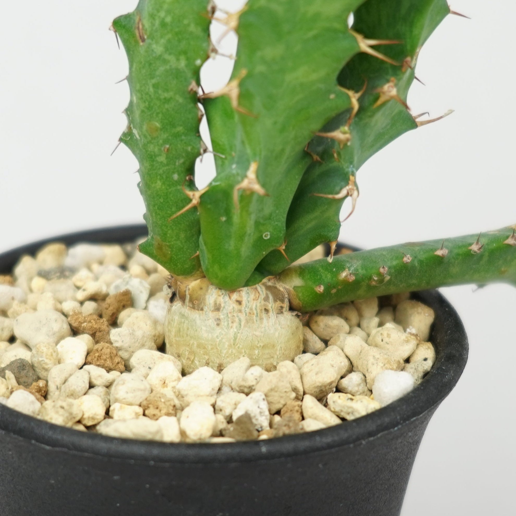 「ユーフォルビア・クラビゲラ」(Euphorbia Clavigera)は、南アフリカ原産のトウダイグサ科に属する塊根植物です。地際から力強く立ち上がる塊根は、まるで風雨に磨かれた岩のような重厚感をまとい、そこから伸びる枝は荒野の生命力を思わせる独特のシルエットを描きます。