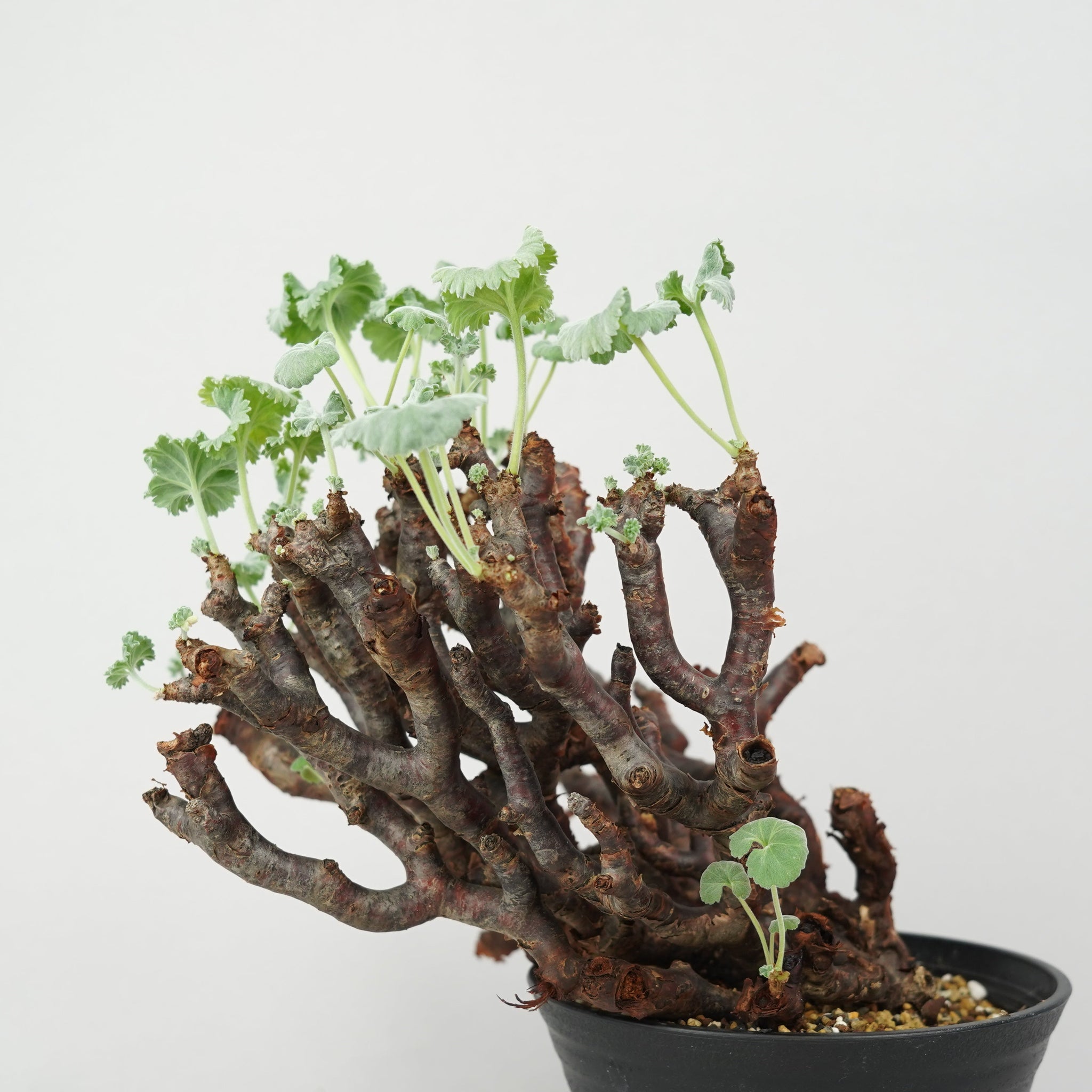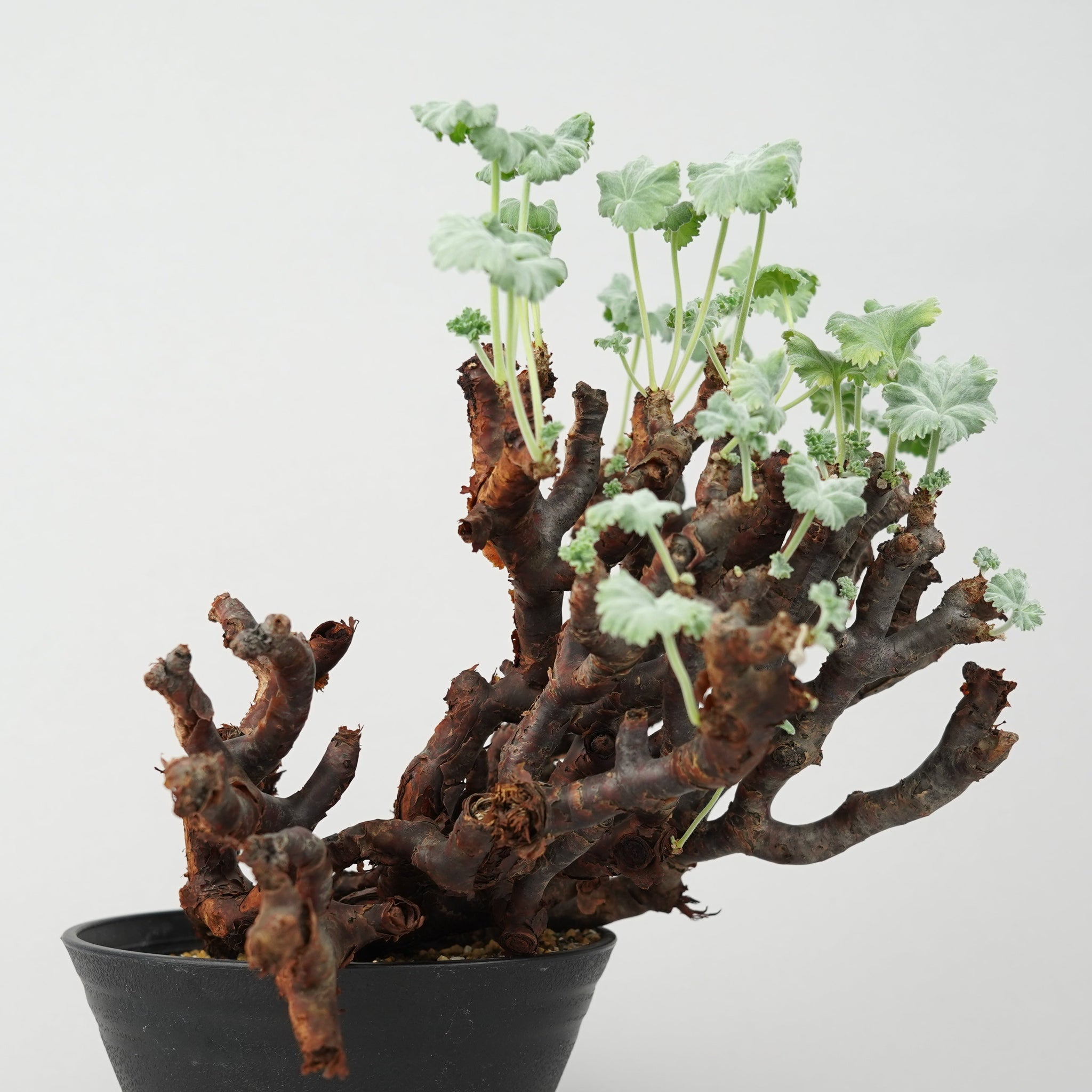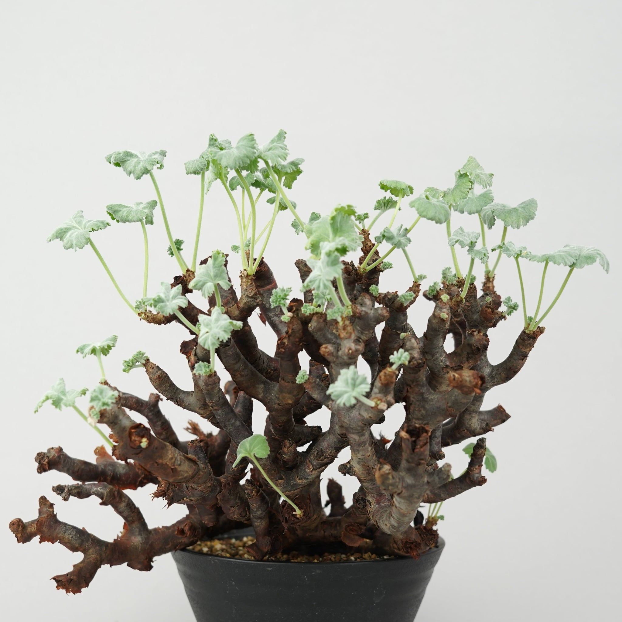 「ペラルゴニウム・ミラビレ」(Pelargonium mirabile)は、南アフリカ原産のフウロソウ科に属する希少な球根性植物です。ふっくらとした塊根と、繊細に切れ込みの入った葉が特徴で、柔らかなシルバーグリーンの色合いが上品な印象を与えます。静かな存在感の中に、力強い生命感を感じさせる美しいコーデックスです。
