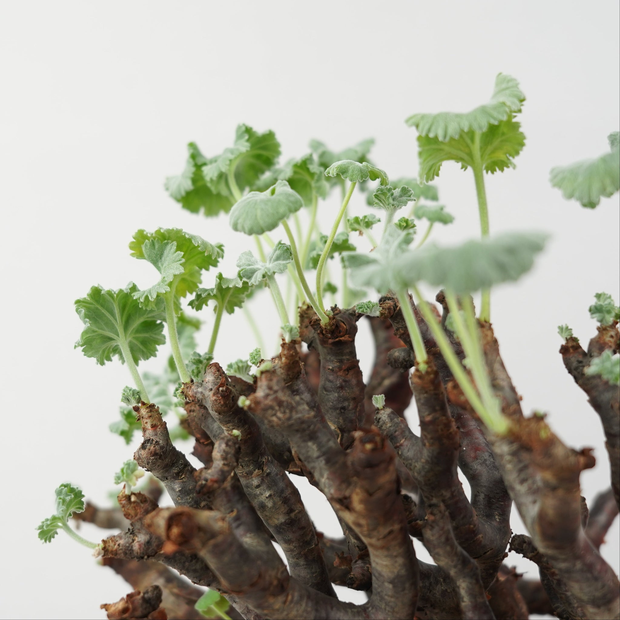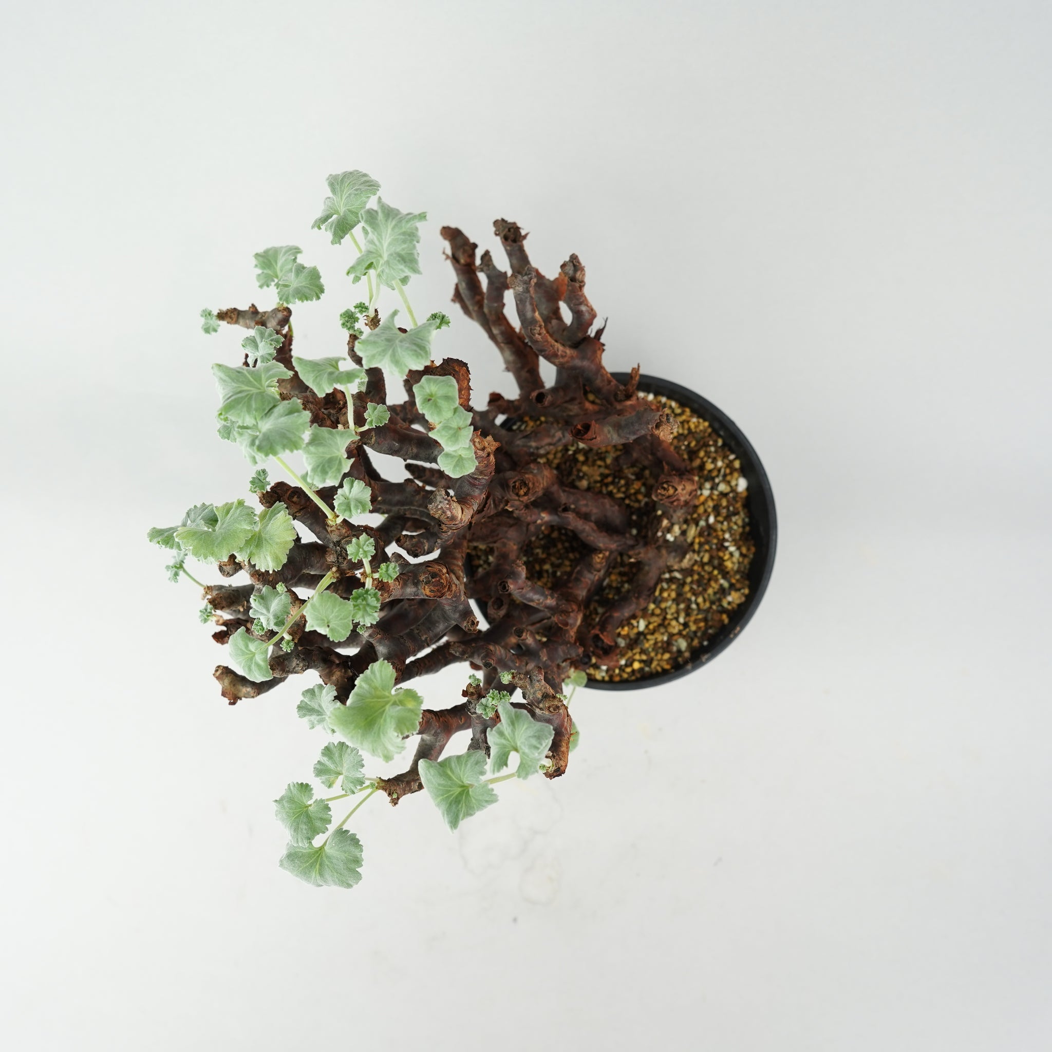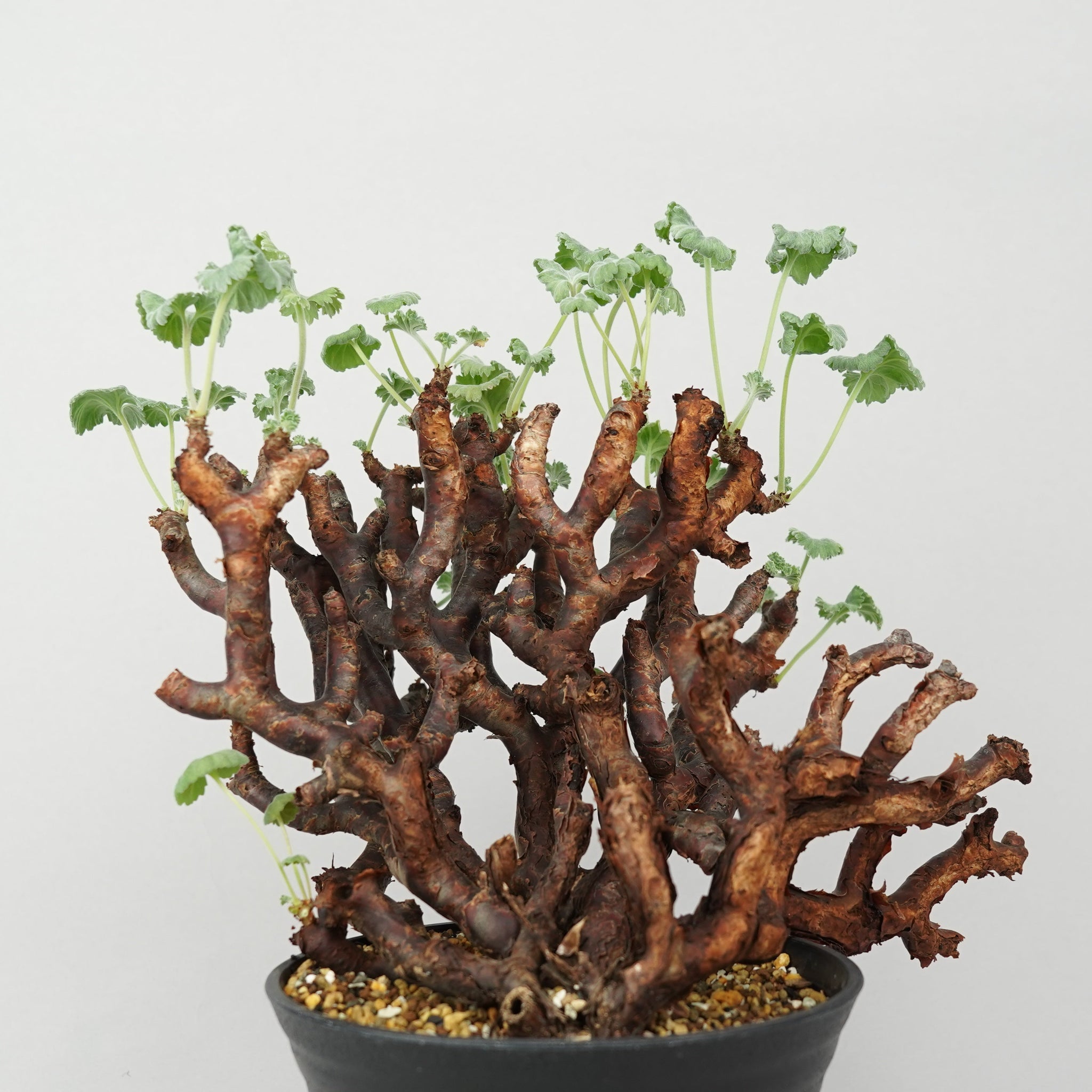 「ペラルゴニウム・ミラビレ」(Pelargonium mirabile)は、南アフリカ原産のフウロソウ科に属する希少な球根性植物です。ふっくらとした塊根と、繊細に切れ込みの入った葉が特徴で、柔らかなシルバーグリーンの色合いが上品な印象を与えます。静かな存在感の中に、力強い生命感を感じさせる美しいコーデックスです。