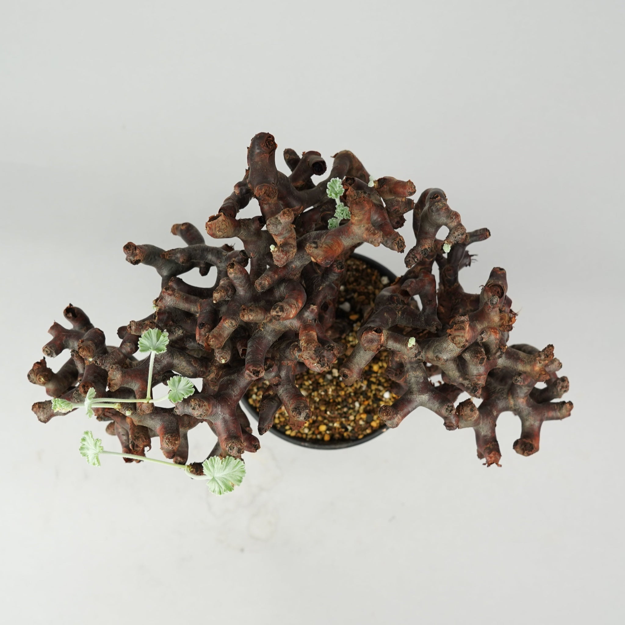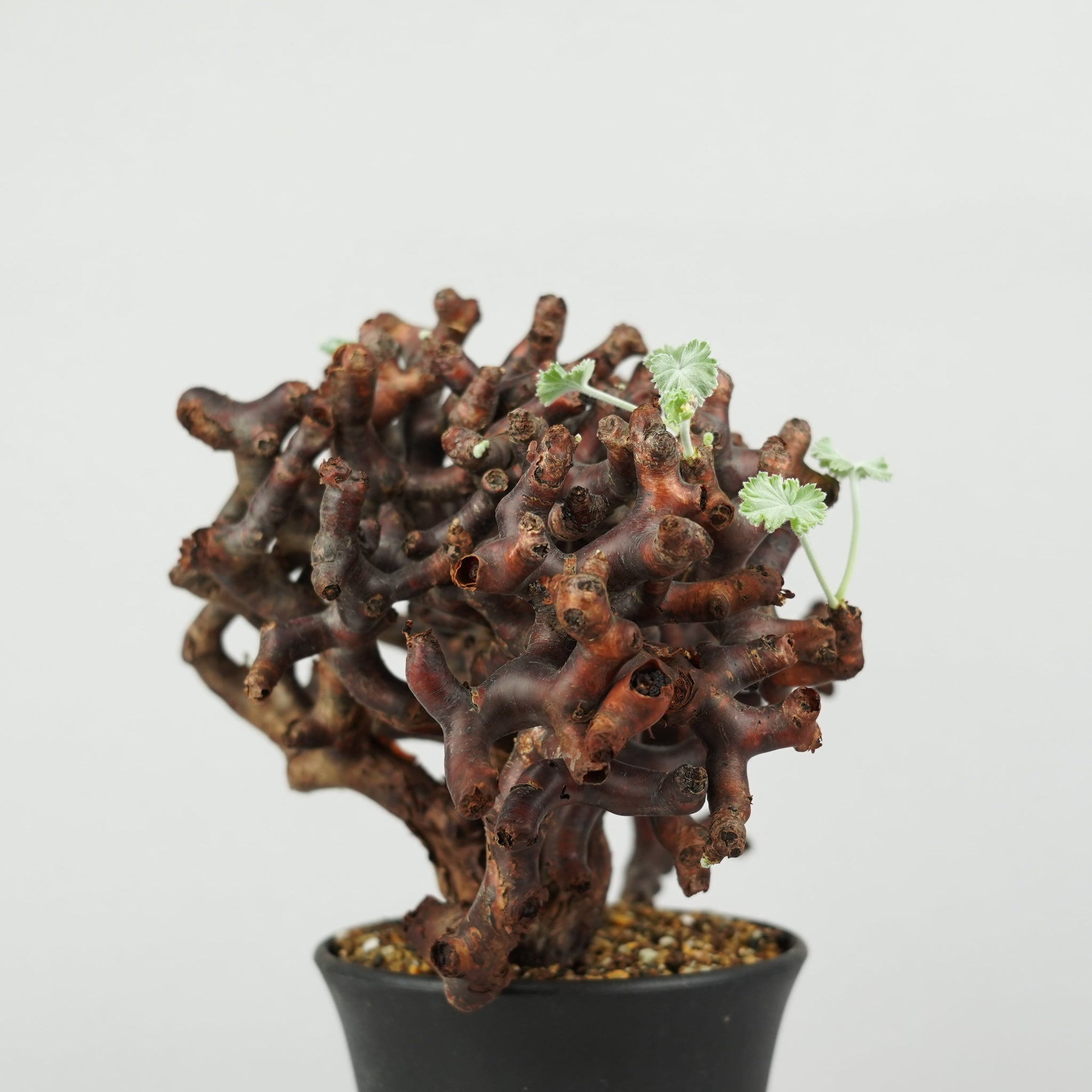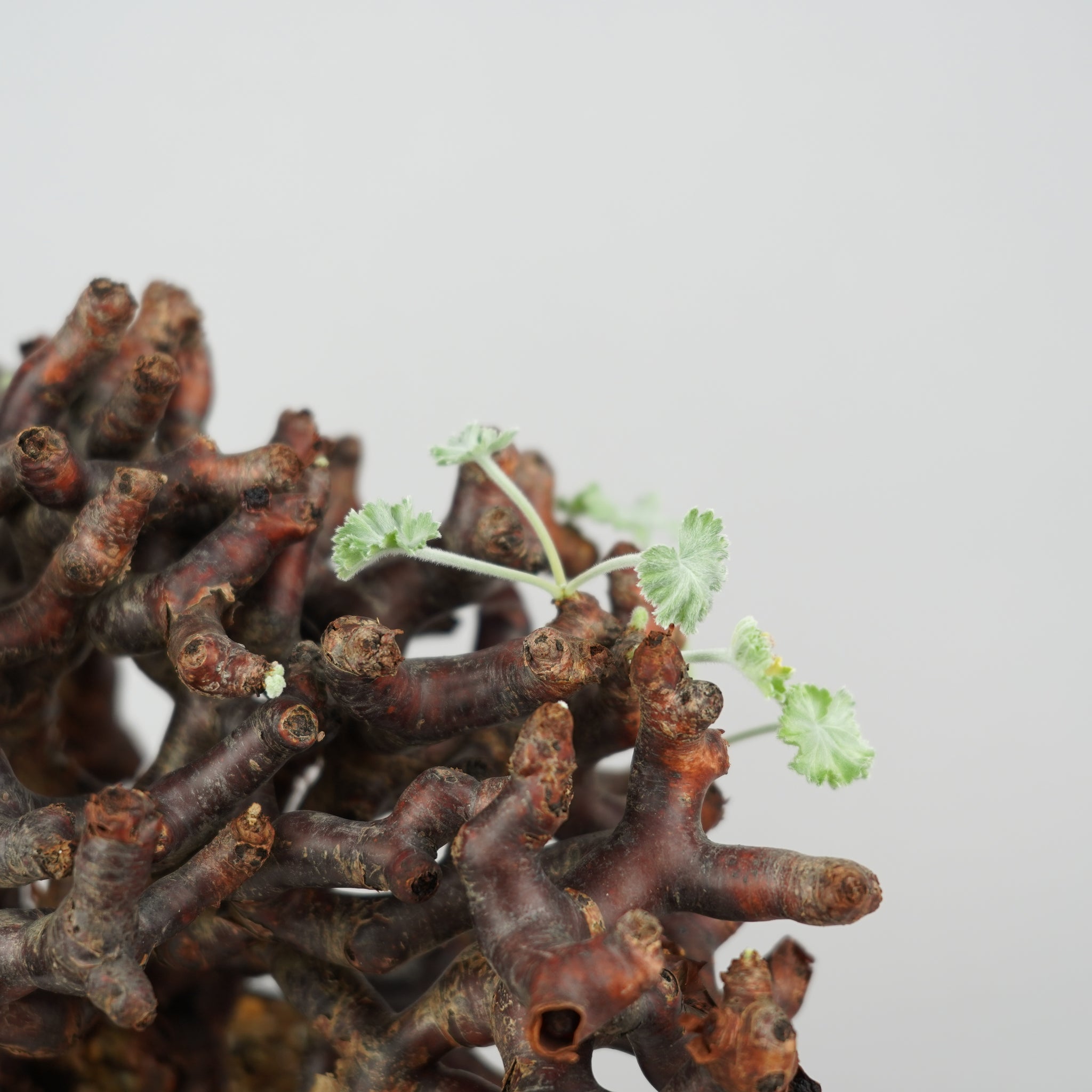 「ペラルゴニウム・ミラビレ」(Pelargonium mirabile)は、南アフリカ原産のフウロソウ科に属する希少な球根性植物です。ふっくらとした塊根と、繊細に切れ込みの入った葉が特徴で、柔らかなシルバーグリーンの色合いが上品な印象を与えます。静かな存在感の中に、力強い生命感を感じさせる美しいコーデックスです。