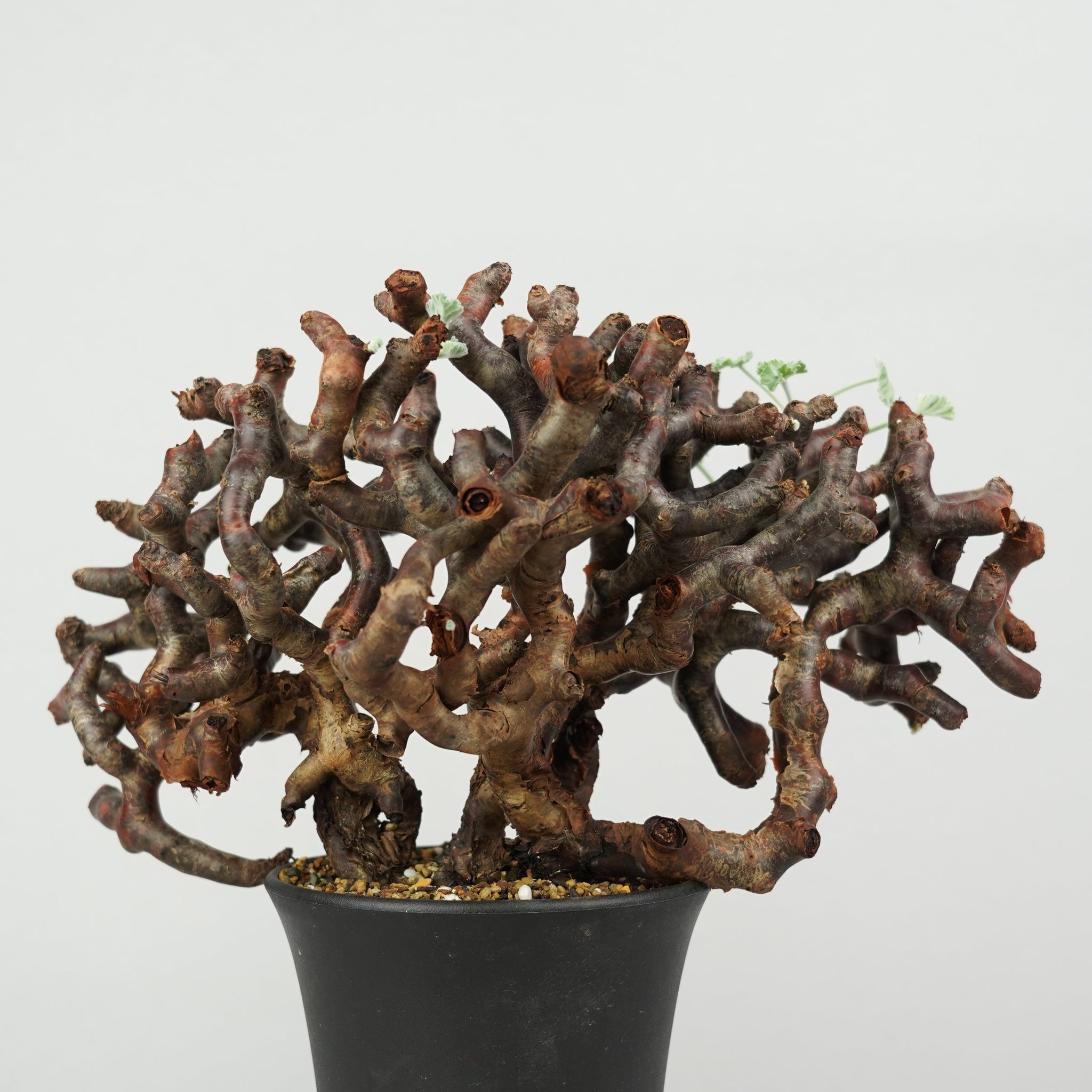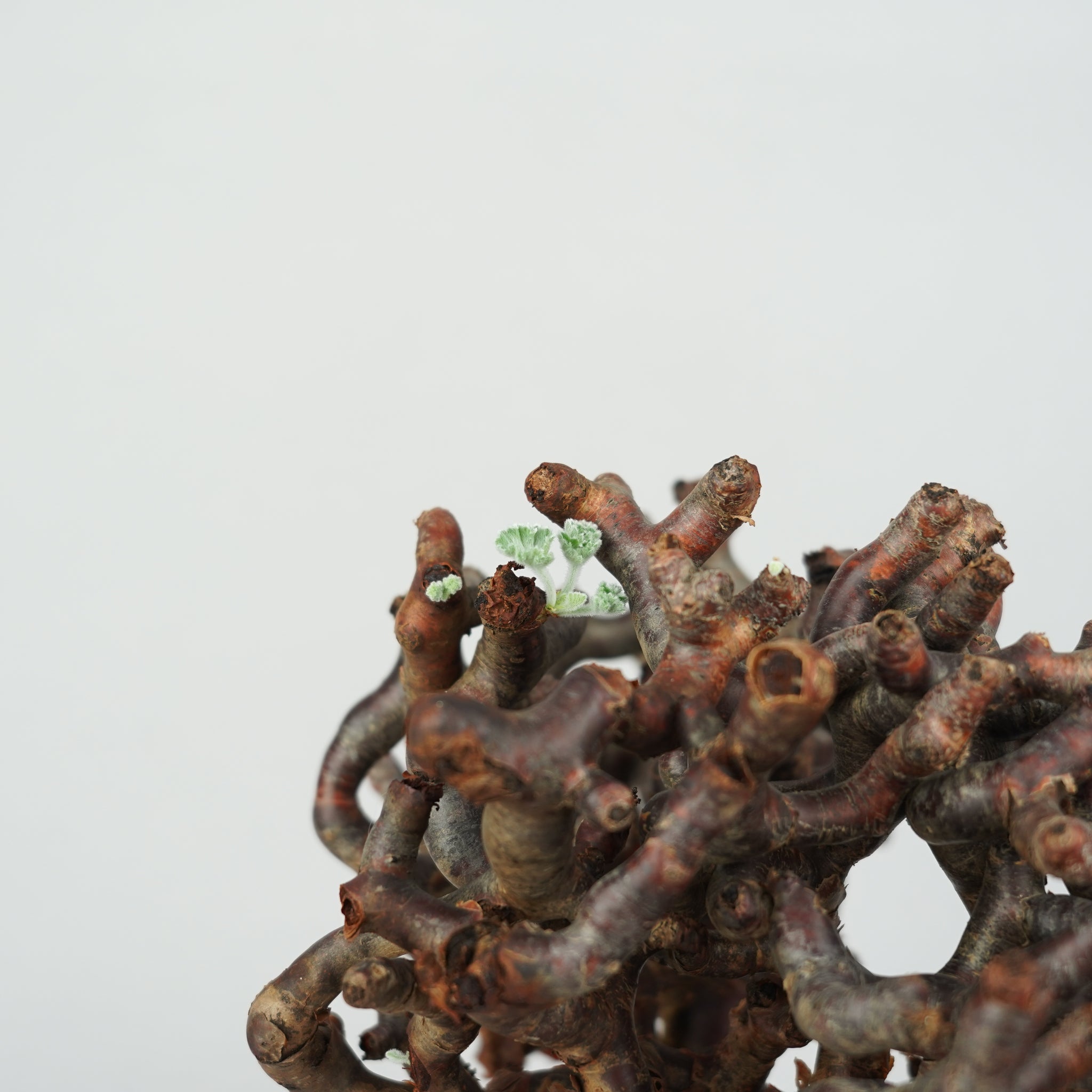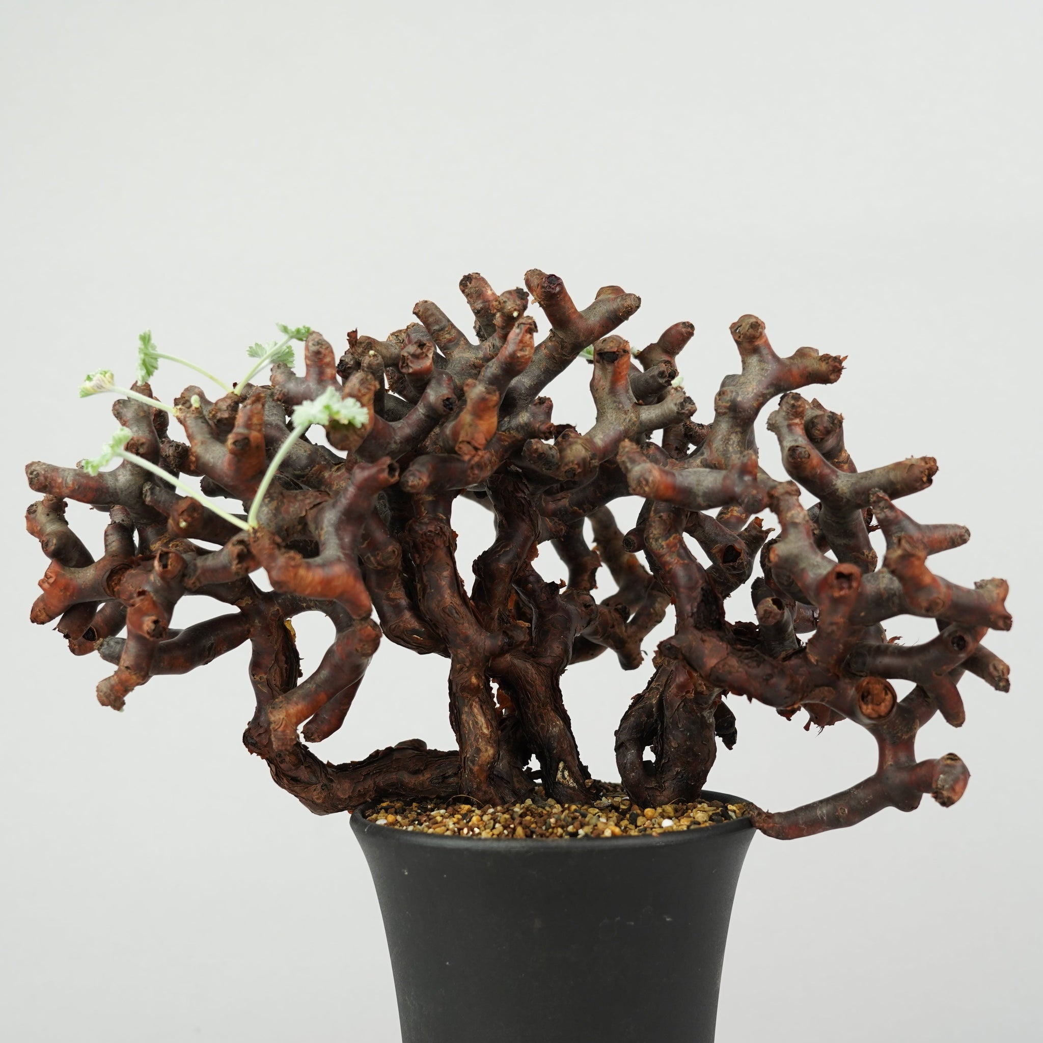 「ペラルゴニウム・ミラビレ」(Pelargonium mirabile)は、南アフリカ原産のフウロソウ科に属する希少な球根性植物です。ふっくらとした塊根と、繊細に切れ込みの入った葉が特徴で、柔らかなシルバーグリーンの色合いが上品な印象を与えます。静かな存在感の中に、力強い生命感を感じさせる美しいコーデックスです。
